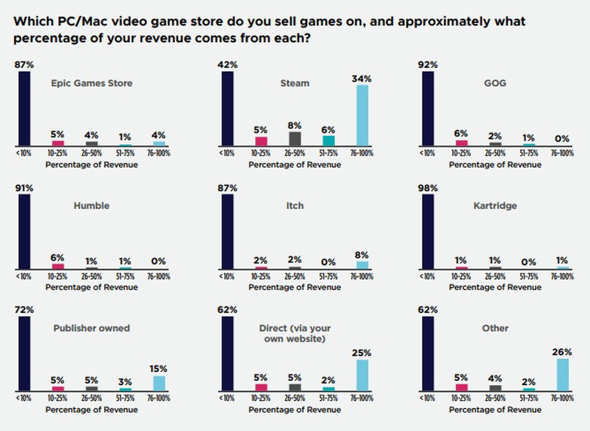Интересно, что пока Epic Games Store по-настоящему важен только для небольшой группы разработчиков. Только 14% опрошенных получают более 10% выручки от этого магазина; для сравнения, для Steam этот показатель составляет 53%.