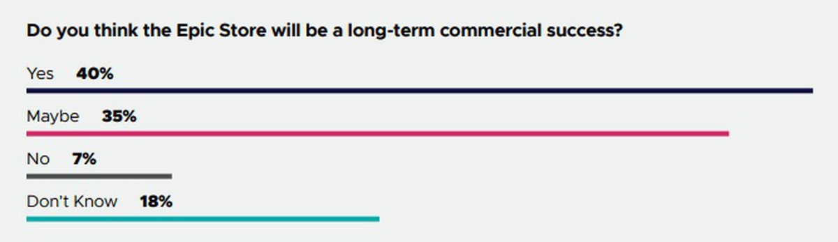 40% опрошенных разработчиков считают, что в долгосрочной перспективе Epic Games Store ждет коммерческий успех, еще 35% допускают, что такой успех возможен. Уверенный отрицательный ответ дали только 7% опрошенных.