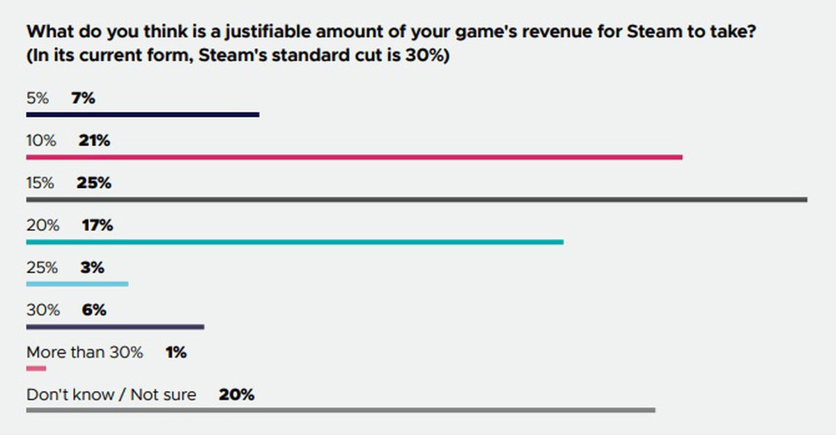 В поддержку комиссии в 30% или более высказались только 7% опрошенных. 25% разработчиков считают, что комиссия должна быть на уровне 15%, еще 21% участников опроса выступают за комиссию Steam в районе 10%.