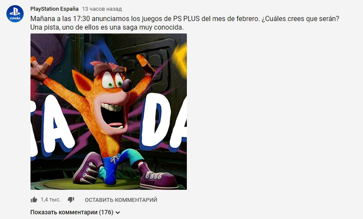 В PlayStation España не упоминают Crash Bandicoot N. Sane Trilogy прямо, но сопроводили свою запись постером с кадрами из игры и Крэшем Бандикутом. Представители PlayStation España не реагируют на предположения фанатов в комментариях.