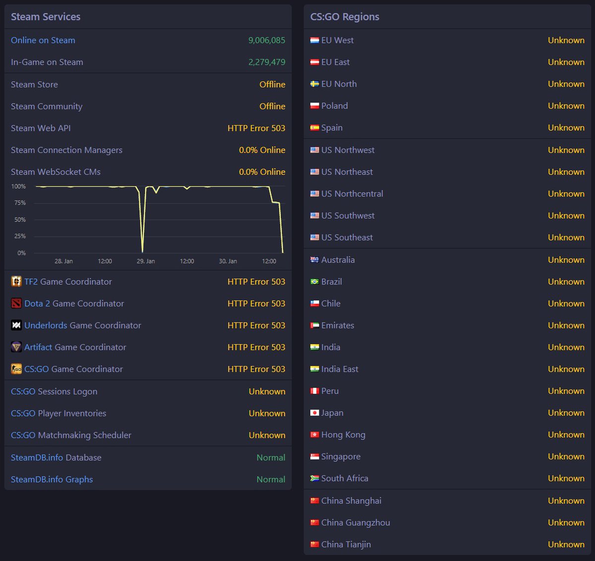 Судя по неофициальному сервису мониторинга Steam Status, проблемы наблюдаются у всех сервисов, так или иначе связанных со Steam. Не работает сам магазин, сообщества, API, различные менеджеры и другие службы.