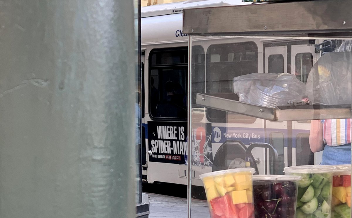 Во-первых, на автобус нанесена надпись New York City Bus. Во-вторых, в кадр попал большой постер с надписью «Where is Spider-Man», «Где Человек-паук»; в нижней части постера можно заметить логотип Daily Bugle, газеты из вселенной «Человека-паука».