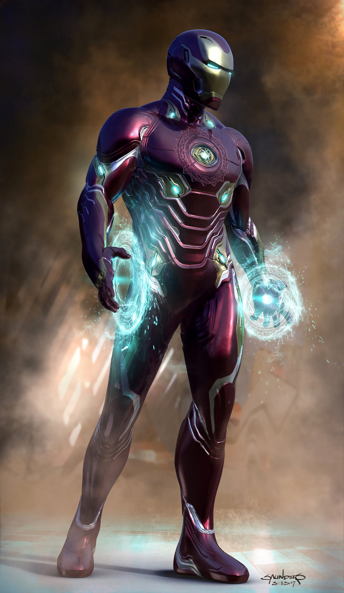 Я попробовал представить, как Глаз Агамото, выжегший символ на нагрудной пластине, мог бы заменить реактор Старка и питать весь костюм.
