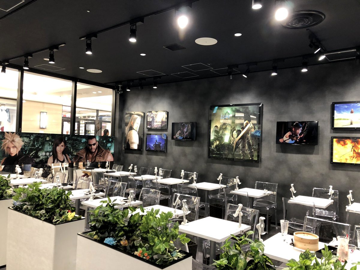 Помимо мониторов, на которых показывают кадры из трейлеров, в кафе развешаны концепт-арты и постеры ремейка. Кроме того, тут выставлены статуэтки ключевых персонажей игры и различный мерчендайз в стиле Final Fantasy VII.