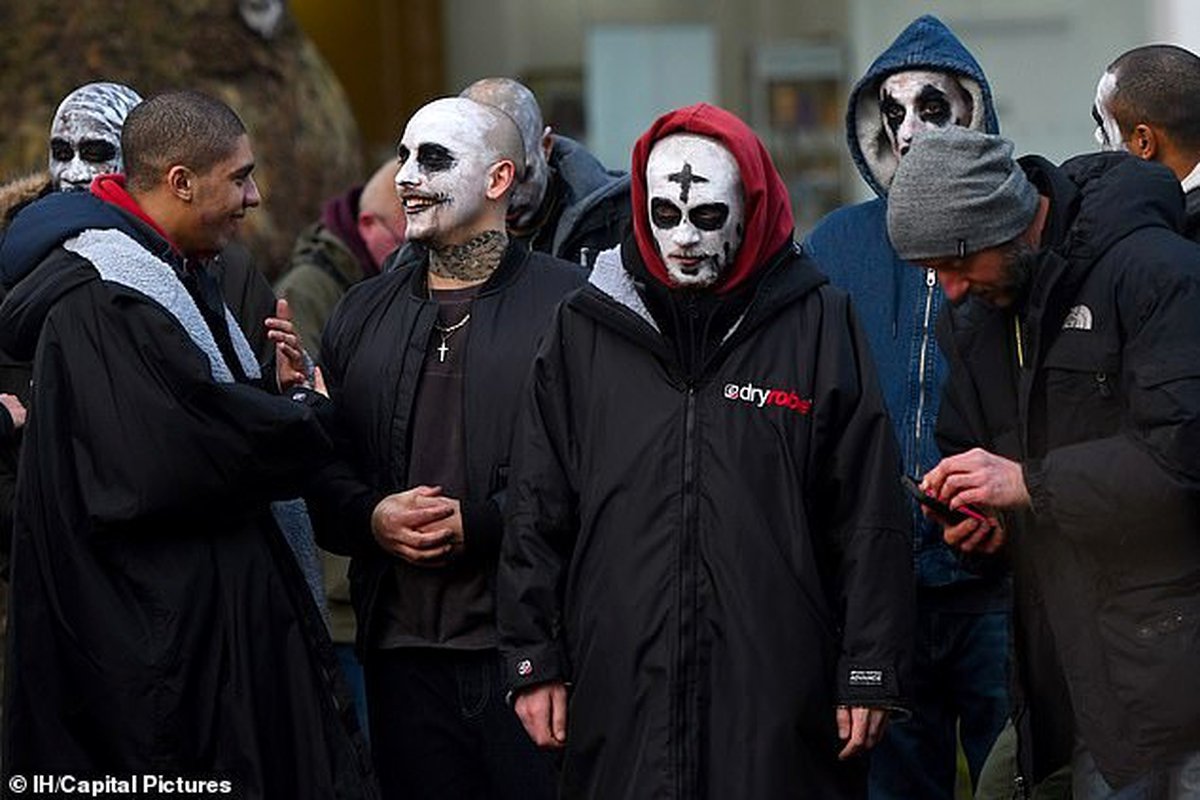 В этой сцене на Брюса Уэйна нападает странная банда — на лицах ее членов нарисованы маски. Это вряд ли последователи Джокера: маски больше всего напоминают скелетов.