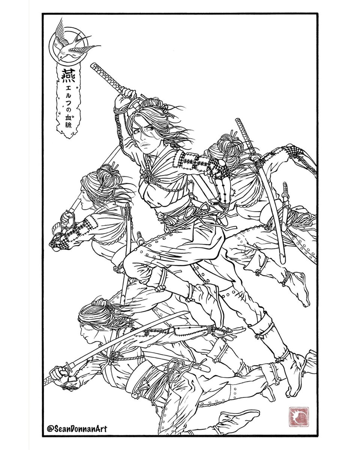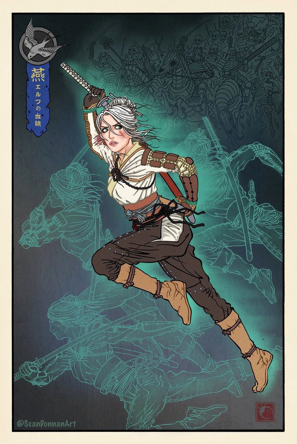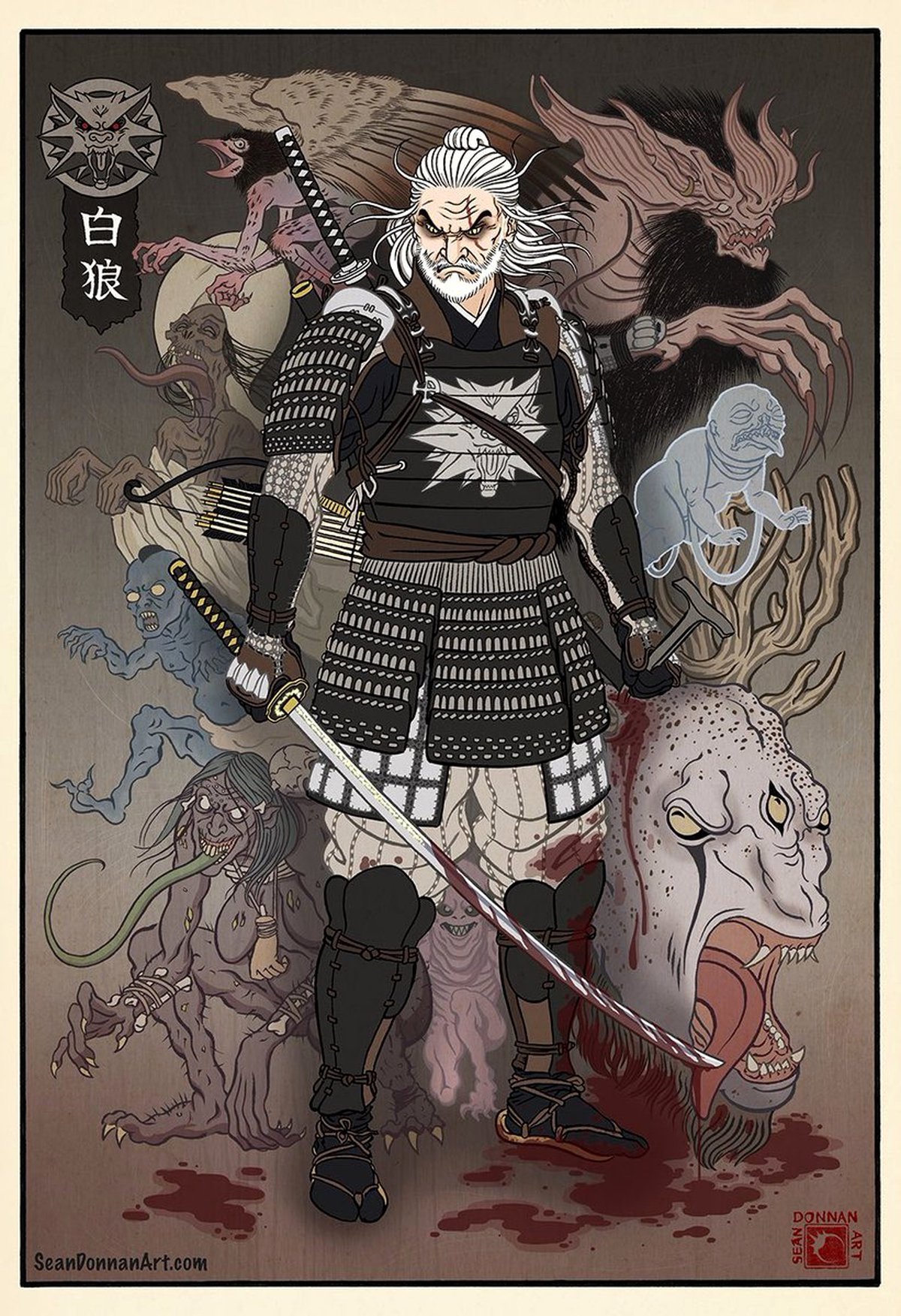 Вместе с ведьмаком художник изобразил сразу несколько существ из мира The Witcher 3, стилизовав их под японских демонов-екай. Сам Геральт получил новое оружие и доспехи: теперь он пользуется серебряной и стальной катанами.