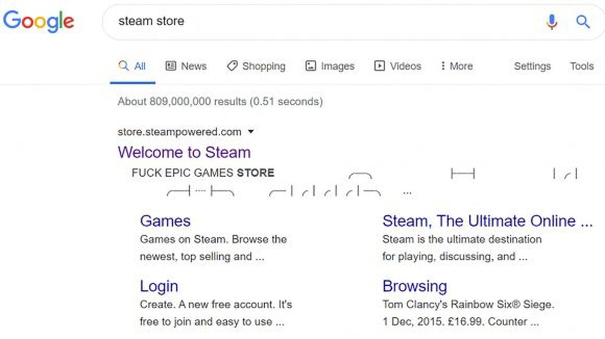 Редакторы PCGamesN, вбившие в поисковик Google запрос «steam store», обнаружили забавную картину. Вместо описания магазина в поиске выводилась фраза «Fuck Epic Games Store» и, видимо, фрагмент какого-то ASCII-арта.