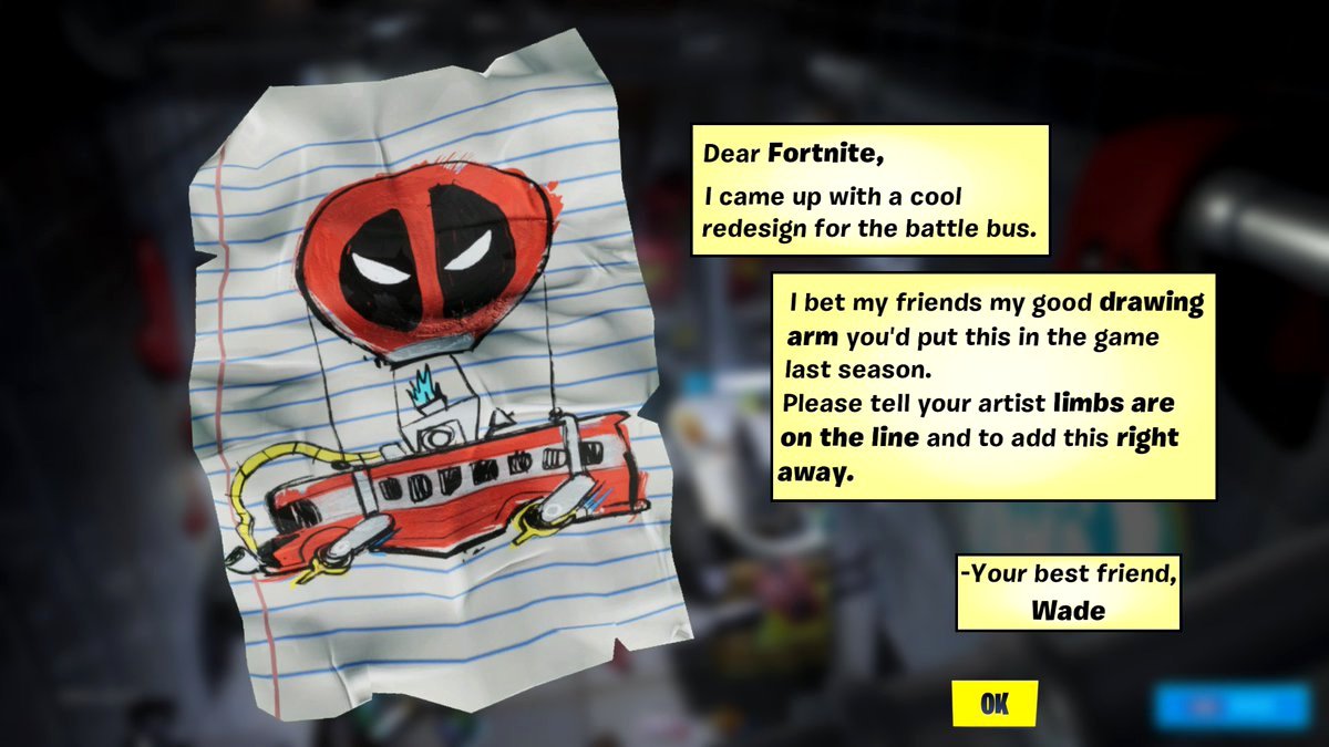 Кроме того, персонаж написал письмо в Epic Games — его можно найти на полу у писсуара. В письме Дэдпул изобразил новую версию боевого автобуса.