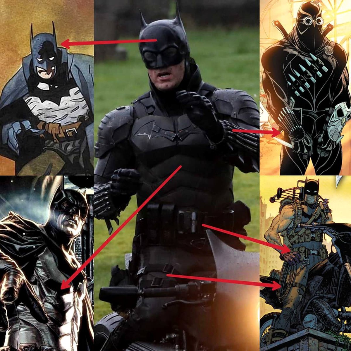 Пока найдено четыре основных источника вдохновения; их суммировали на одной картинке, наглядно показав сходство снаряжения кинематографического Бэтмена и героев комиксов. К примеру, шлем напоминает наряд Темного Рыцаря из «Готэма в газовом свете» Брайана Августина и Майка Миньолы — это история о Бэтмене в XIX веке.
