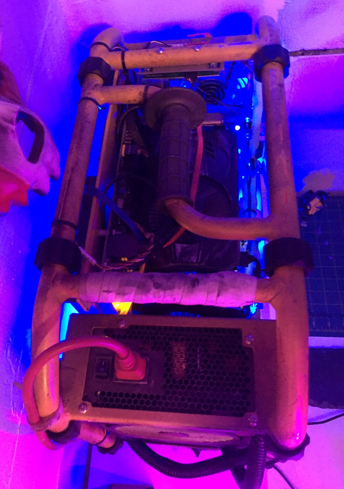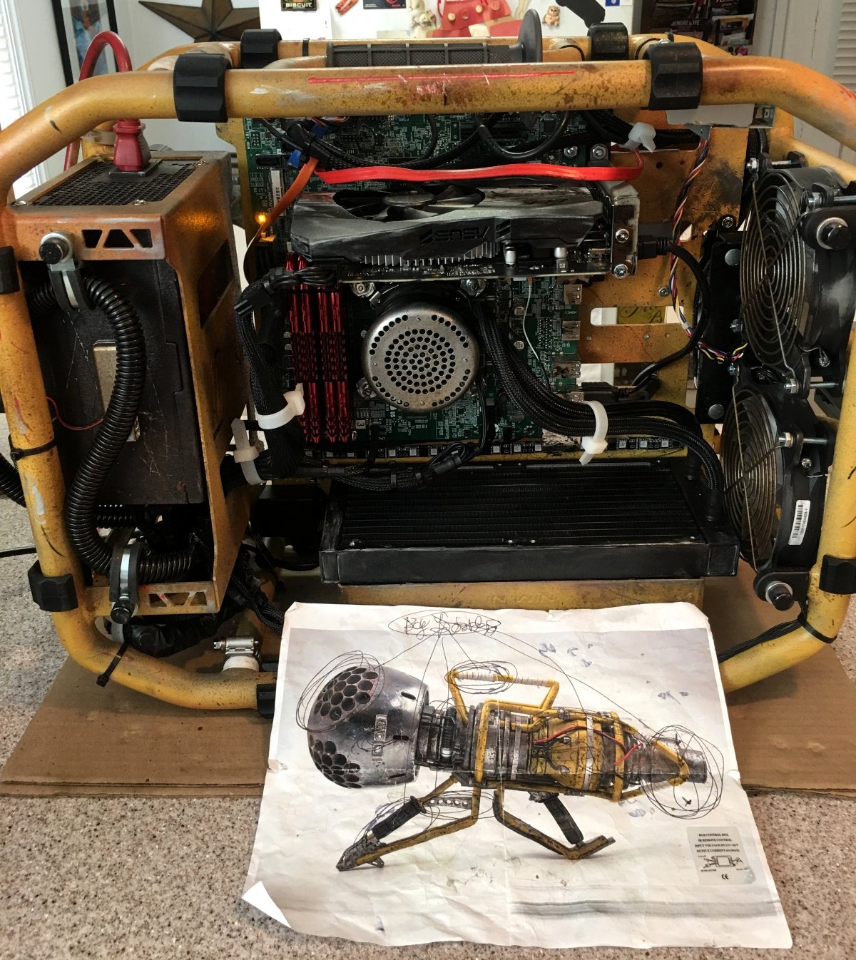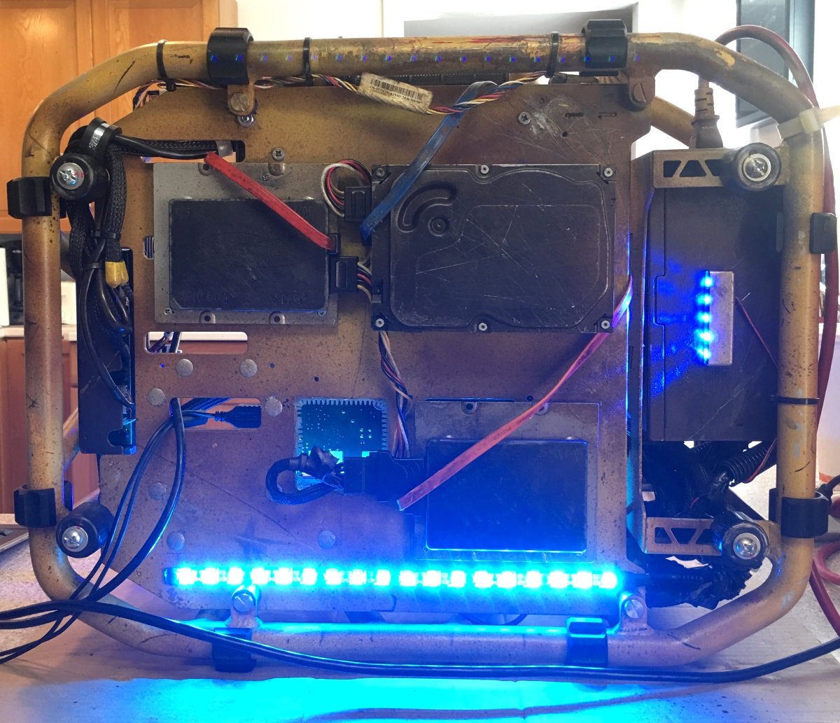 Корпус представляет собой трубчатую раму, к которой приделана пластина для крепления материнской платы. Трубки расположены таким образом, чтобы на них могли крепиться блок питания, части системы охлаждения и другие компоненты.