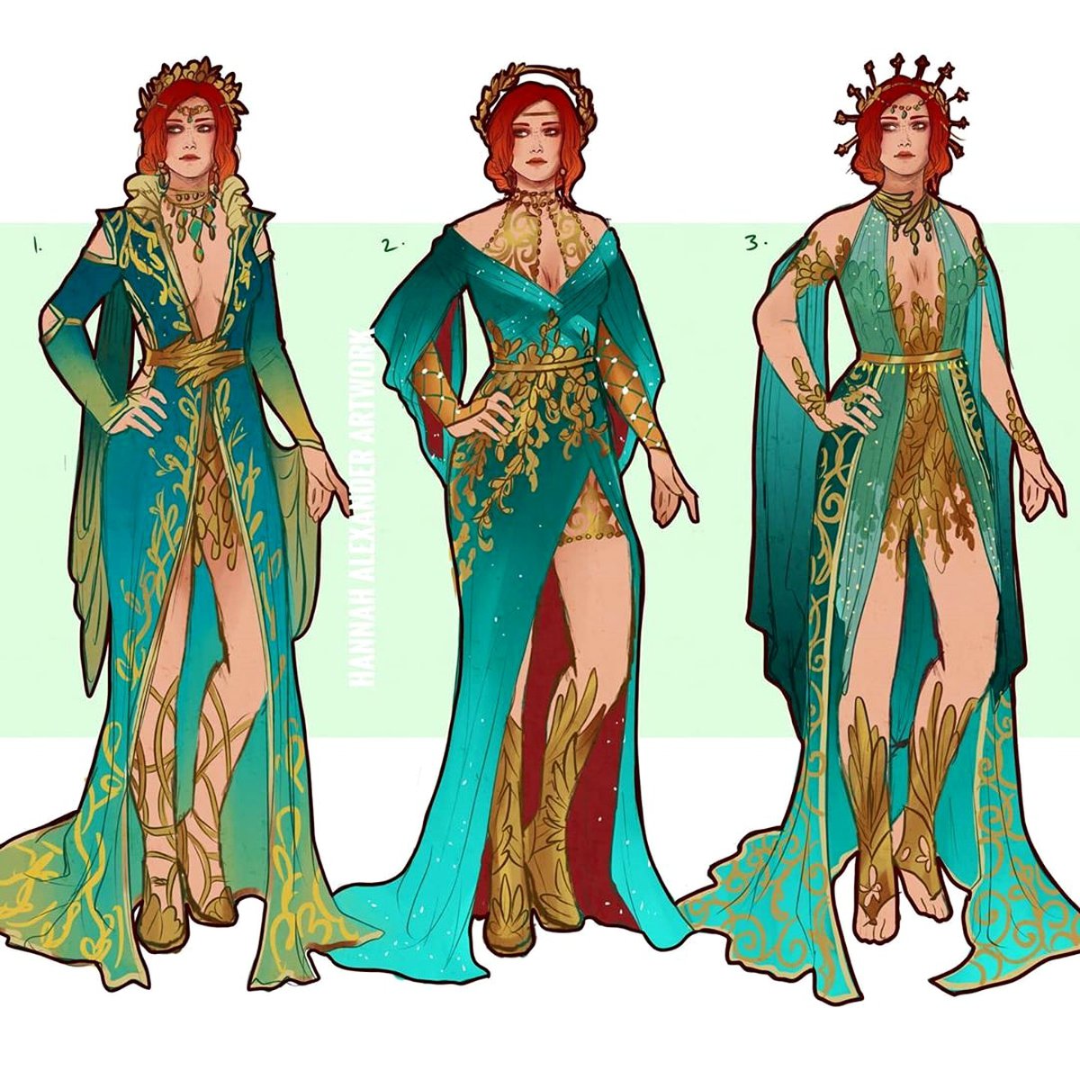Пока Ханна успела поработать с тремя персонажами The Witcher 3: Цири, Йеннифер и Трисс. Самыми знакомыми выглядят наряды Трисс, созданные на основе платья из DLC к игре. Цири и Йеннифер это другая история — их костюмы совершенно новые.