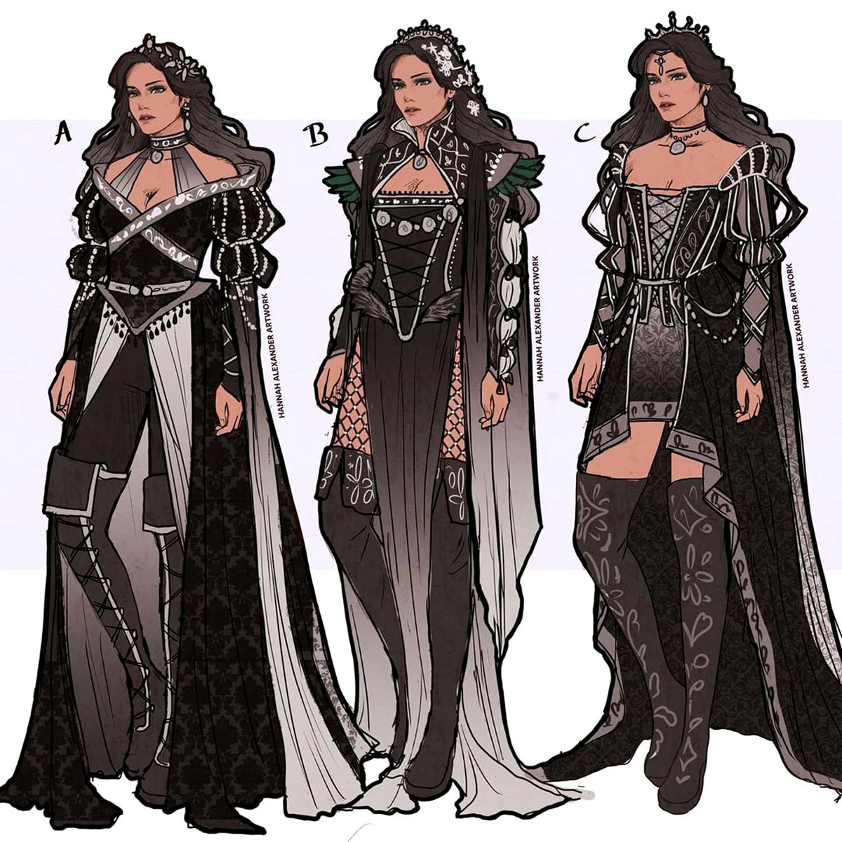 Колдунья получила несколько черно-белых платьев со сложными узорами и вышивкой, а Цири достались наряды, больше напоминающие легкие доспехи. Для последнего арта Александер утяжелила броню, снабдив ведьмачку мощным наплечником.