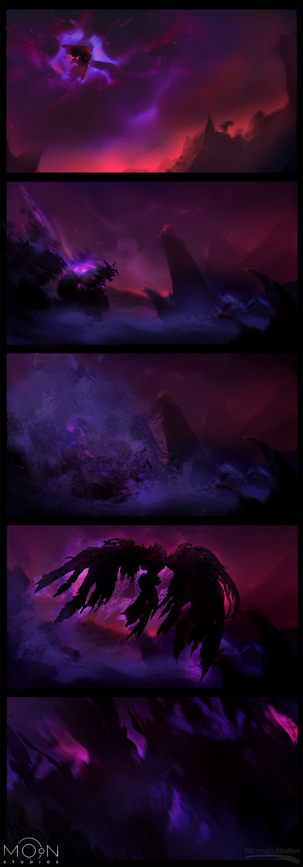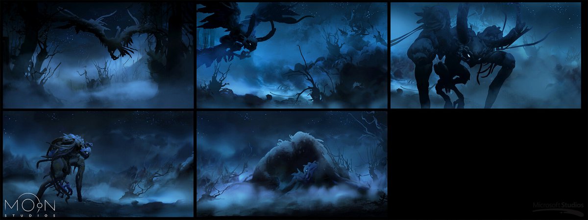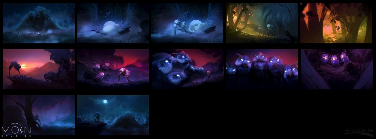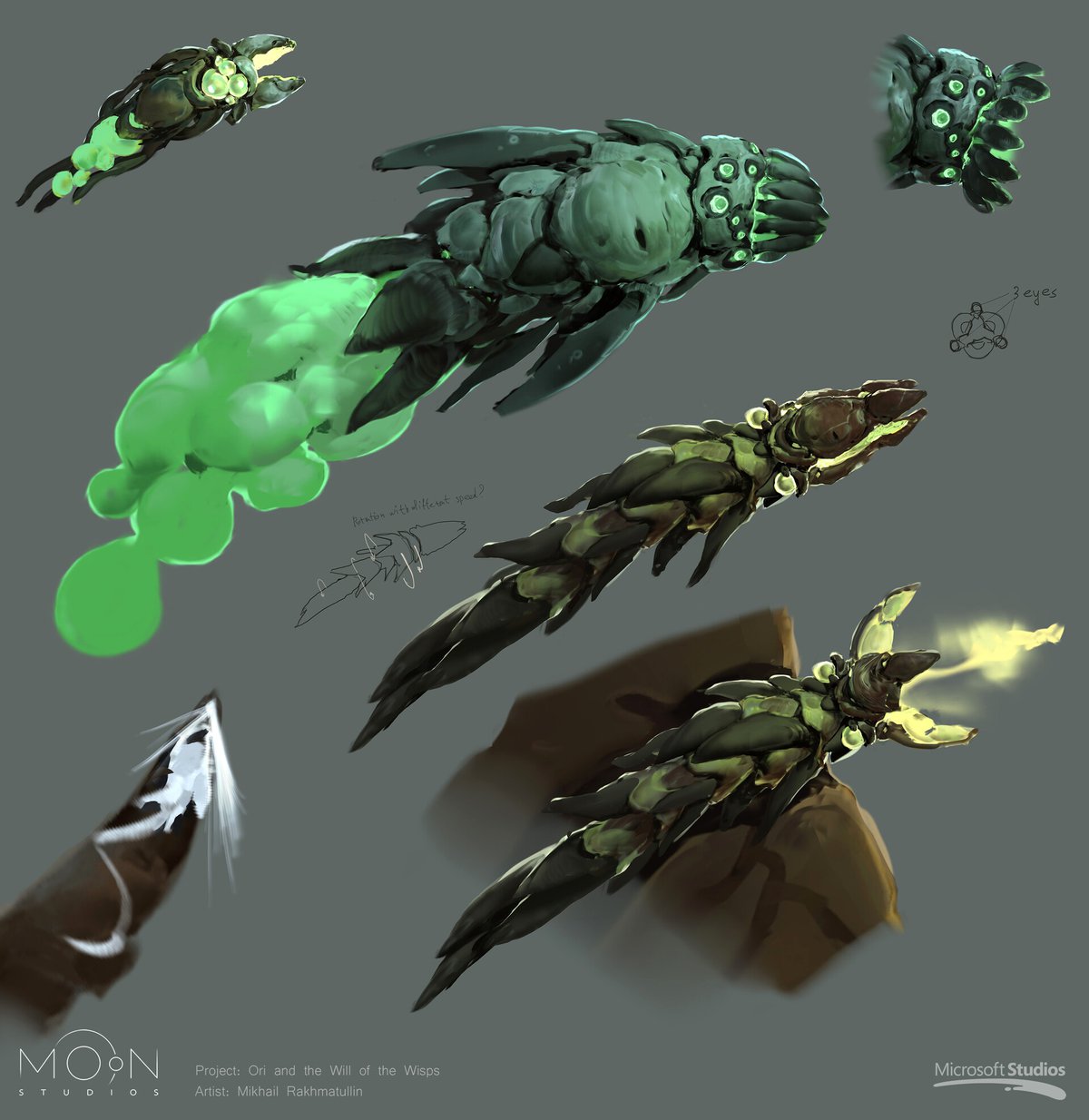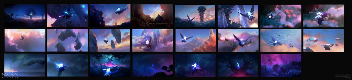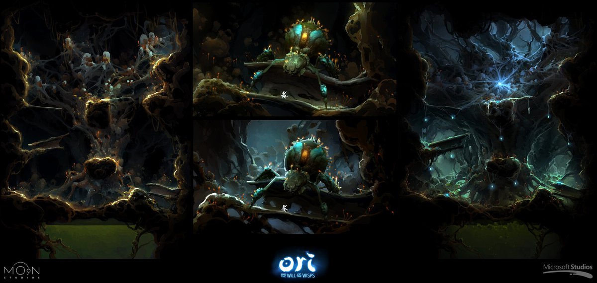 Помимо набросков локаций, иногда больше напоминающих картины, у нас есть концепты противников Ори и нескольких боссов. Также художники опубликовали несколько раскадровок сюжетных катсцен игры.