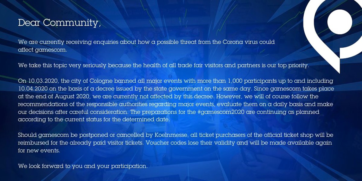 Однако мы, конечно, следуем рекомендациям представителей власти относительно проведения крупных мероприятий, постоянно поддерживаем с ними контакт и тщательно анализируем все принимаемые решения. Сейчас подготовка к #gamescom2020 идет в соответствии с планом.