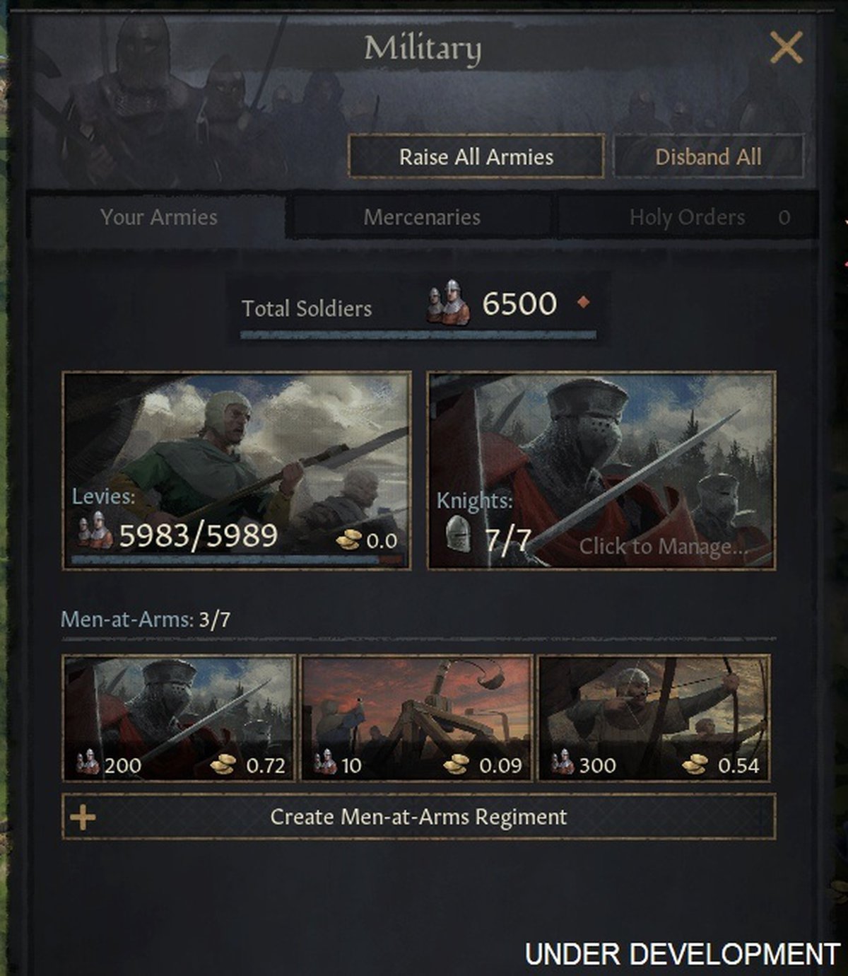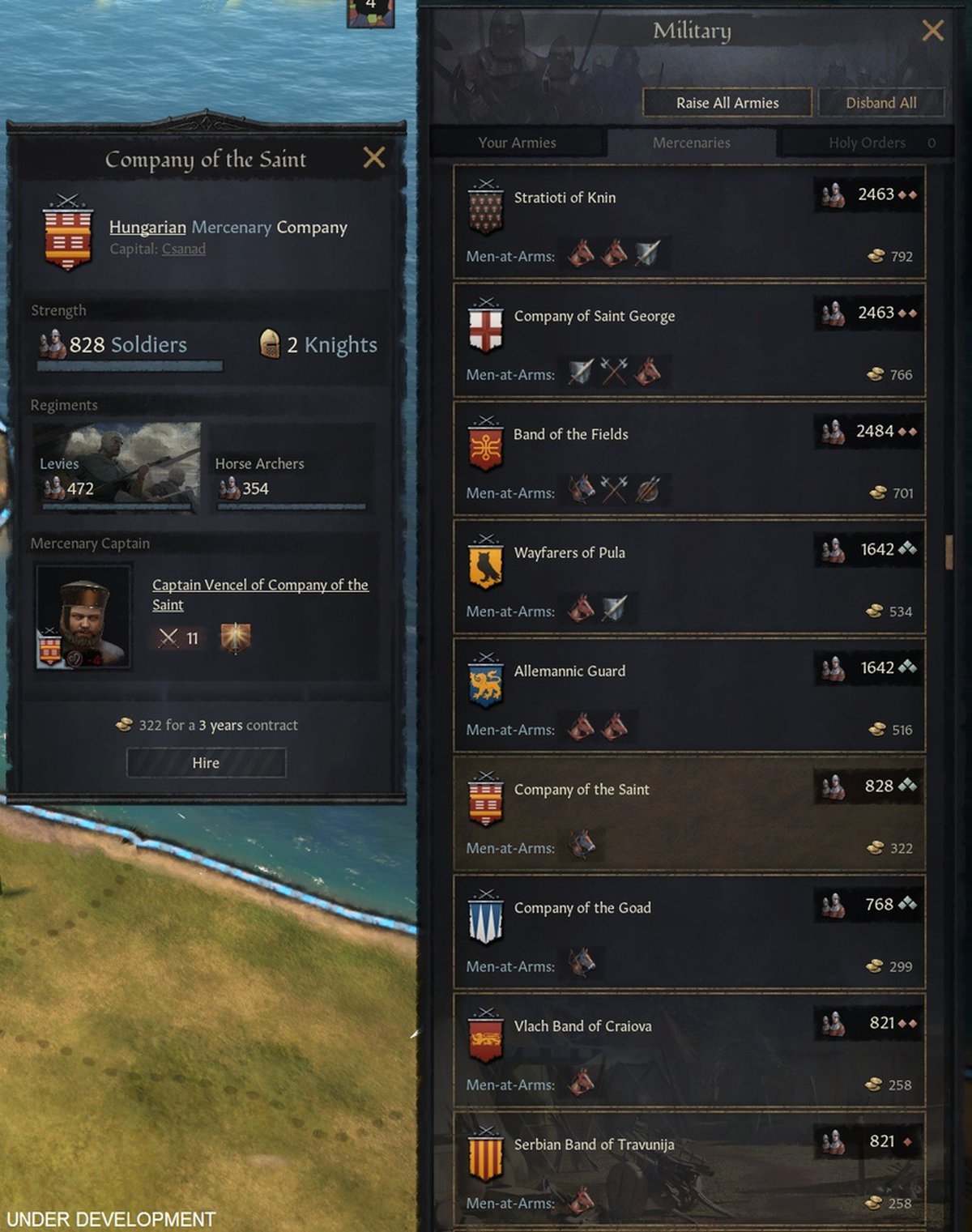 Отряды наемников привязаны к конкретным графствам культуры. Каждая культура может создать не больше трех отрядов, каждый последующий отряд будет стоить дороже предыдущего. Вербовать наемников можно на определенном расстоянии от графства, к которому они привязаны.