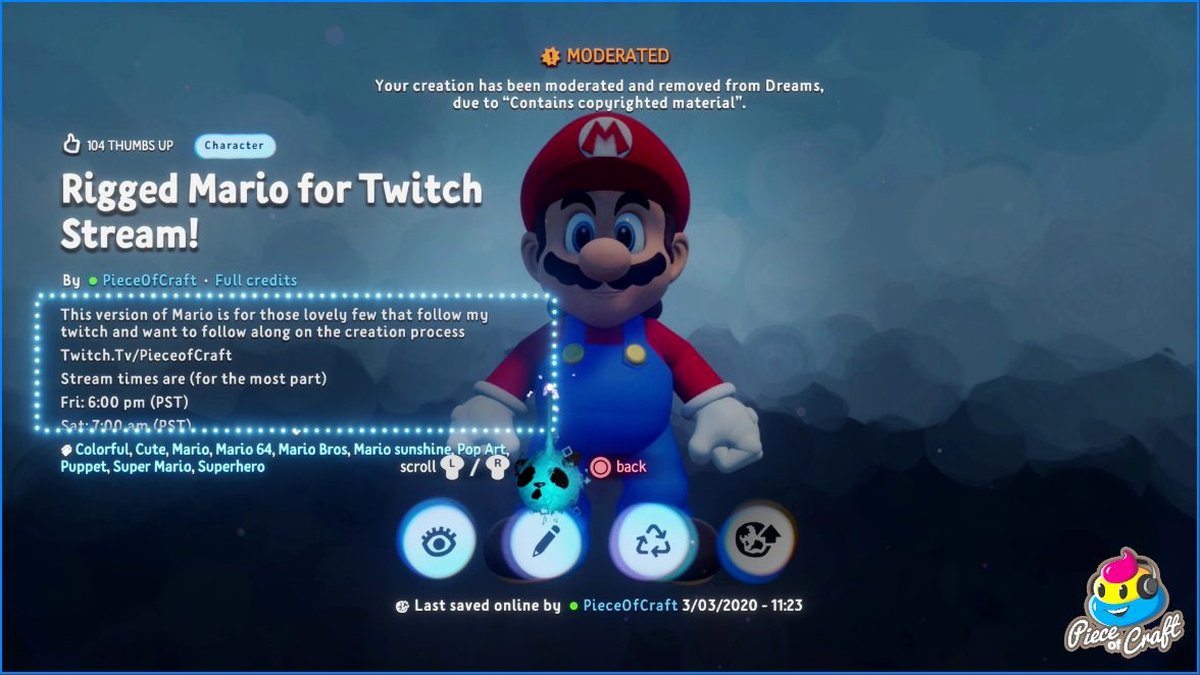 По словам стримера, после блокировки ему пришло письмо от юридического департамента Sony Interactive Entertainment Europe. В письме сообщалось, что Nintendo не хотят, чтобы персонажи вселенной Super Mario использовались в проектах Piece of Craft.