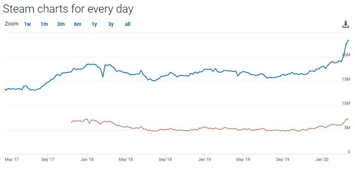 Сейчас пиковый онлайн в магазине увеличивается практически каждый день, вероятно, в ближайшие недели Steam обновит оба рекорда. Этого не произойдет, только если карантин будет резко снят. Пока это маловероятно.