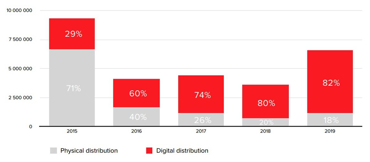 По объему продаж 2019 год стал вторым в истории игры: лучше The Witcher 3 продавался только на релизе, в 2015 году. За весь год было продано порядка 6.5-7 миллионов копий игры, большую часть реализовали в цифровой форме.