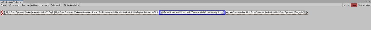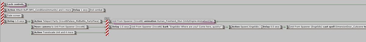 Как же они устроены внутри? На самом базовом уровне катсцена это цепочка команд, выполняющихся по очереди. Например, NPC бежит в конкретное место, достает оружие из ножен, говорит фразу и затем начинает бой.