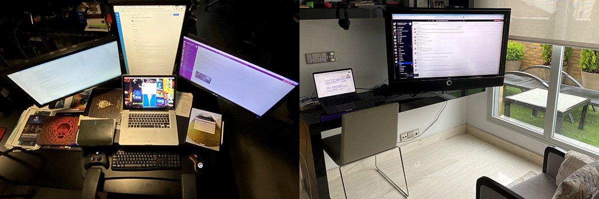 Раулю, возможно, проще всего: он привык работать из дома и заготовил несколько рабочих мест под разные задачи и настроения. Есть многомониторная система для разработки, уютная комната с большим окном — плюс Рубио захватил кусок обеденного стола.