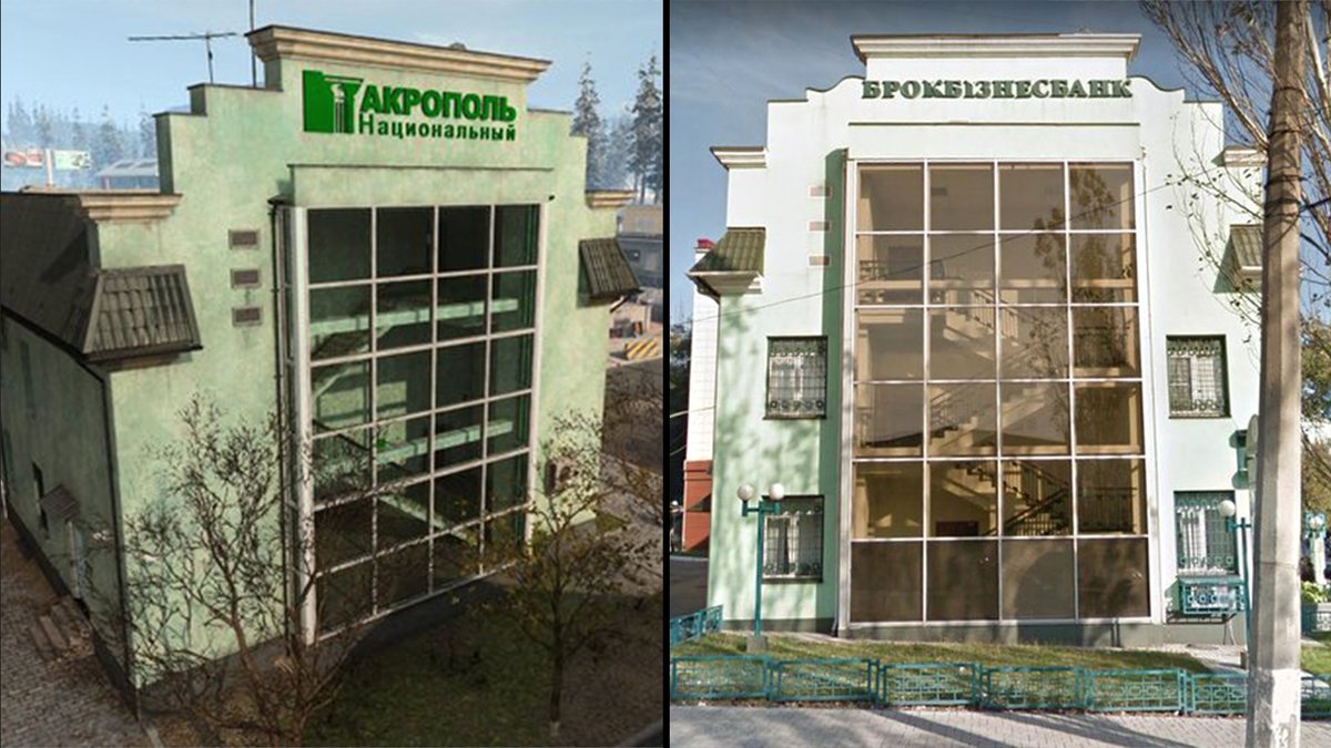 Самое явное заимствование. Здание реального донецкого Брокбизнесбанк отличается необычной архитектурой, дизайнеры Warzone достаточно точно его воссоздали — тут нет боковых окон, зато есть кондиционер, висящий на стене.