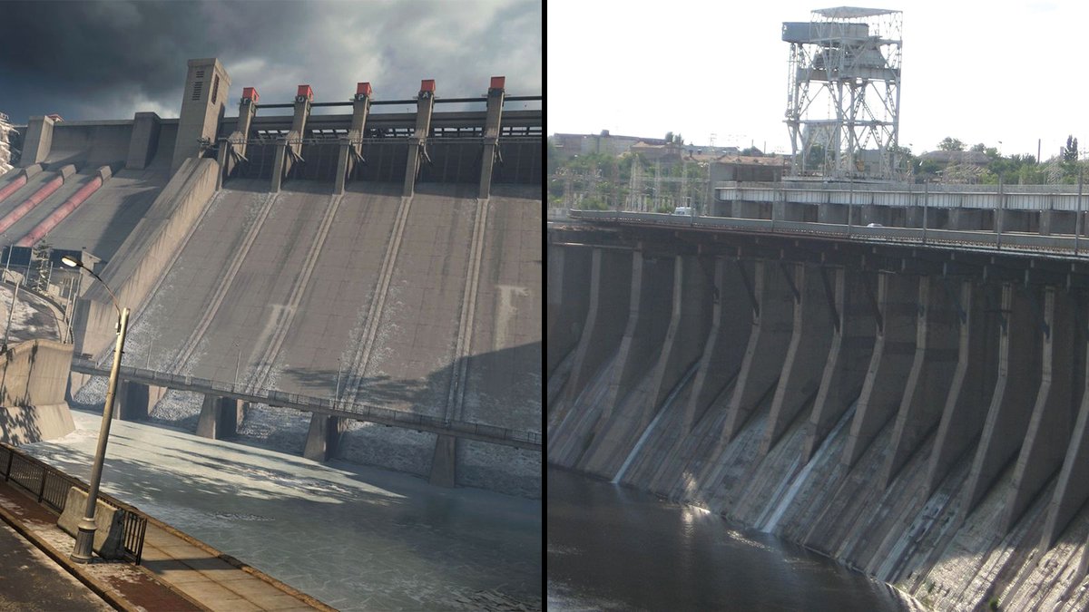 Роль дамбы Верданска сыграла Днепрогэс: нижня часть реальной плотины не слишком похожа на виртуальную, зато верхние гребни практически идентичны.