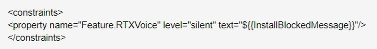 Для этого нужно модифицировать установочный пакет плагина. Сперва его надо разархивировать; затем следует найти файл NVRTXVoice\NvAFX\RTXVoice.nvi, расположенный в папке, куда был разархивирован плагин, и удалить следующий раздел.