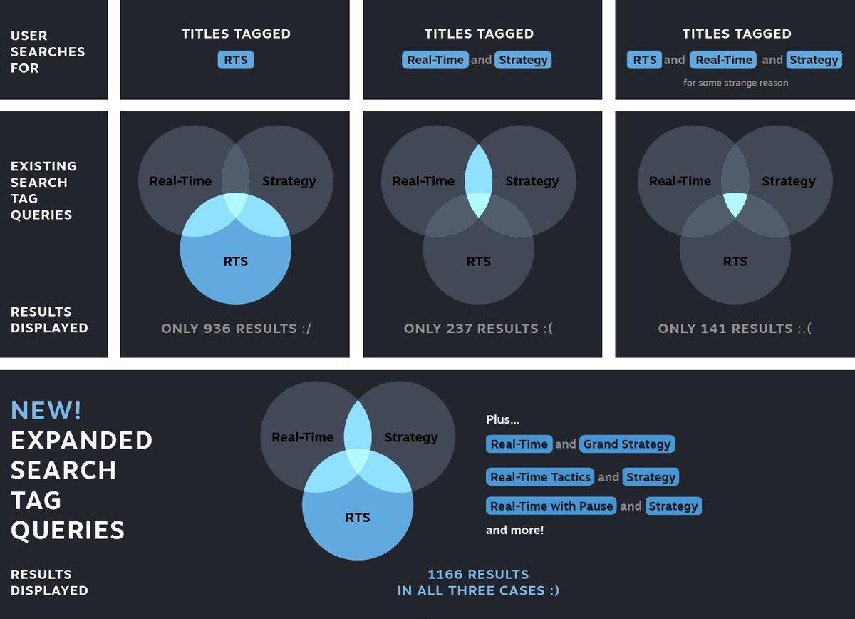 Чтобы решить проблему, в Valve создали алгоритм, автоматически расширяющий запрос и дополняющий метки, выбранные игроком. Он умеет разбивать метки вроде «Стратегия в реальном времени» на «Стратегия» и «В реальном времени».