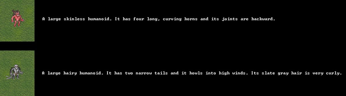 Судя по скриншотам, генератор верно понял, что первый монстр должен быть лишен кожи, а второму следует быть мохнатым. Рога первого тролля причудливо изгибаются, а у второго и в самом деле два длинных хвоста.