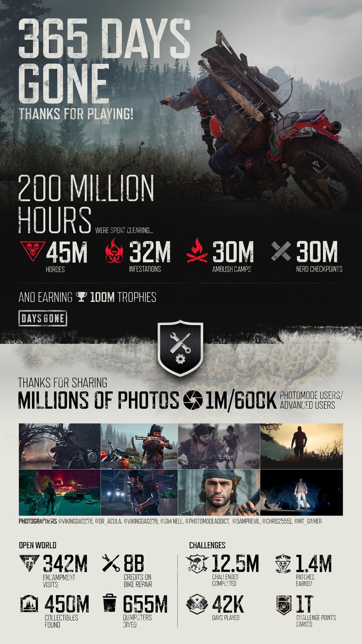 За 365 дней фанаты провели в мире Days Gone 200 миллионов часов. Они зачистили 30 миллионов КПП NERO и столько же лагерей, разобрались с 45 миллионами орд зараженных и потратили 8 миллиардов на ремонт своих байков.