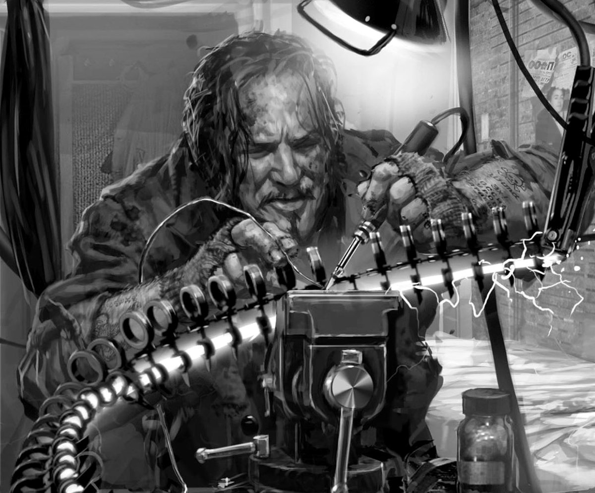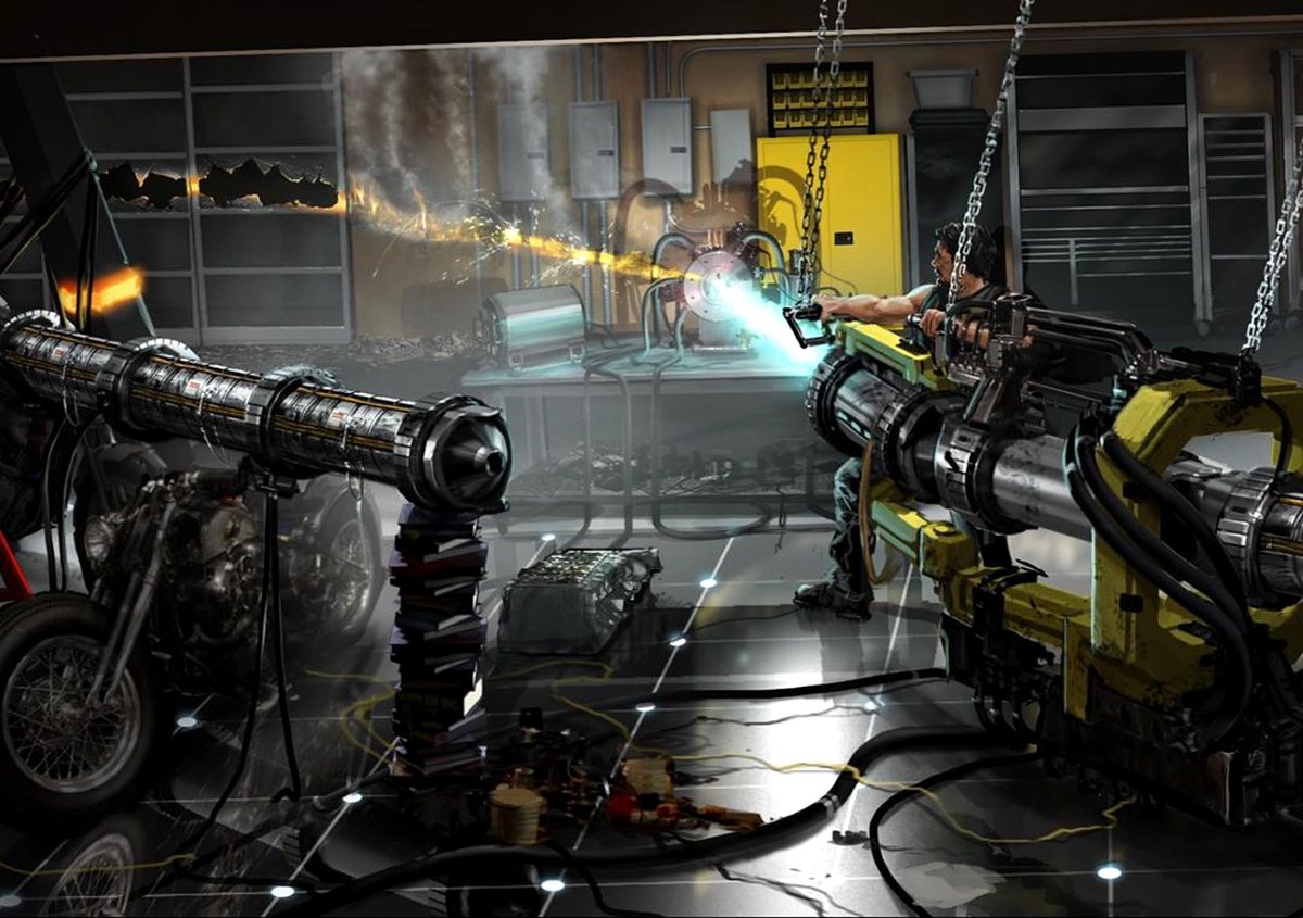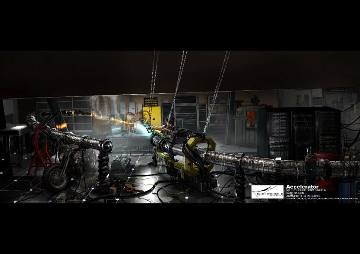На другом концепте можно увидеть процесс изготовления такой плети в лаборатории Ванко. Еще один арт посвящен ускорителю частиц, созданному Тони Старком: эта версия отличается от той, что попала в фильм. Кажется, на концепте Старк обошелся без щита Капитана Америка.
