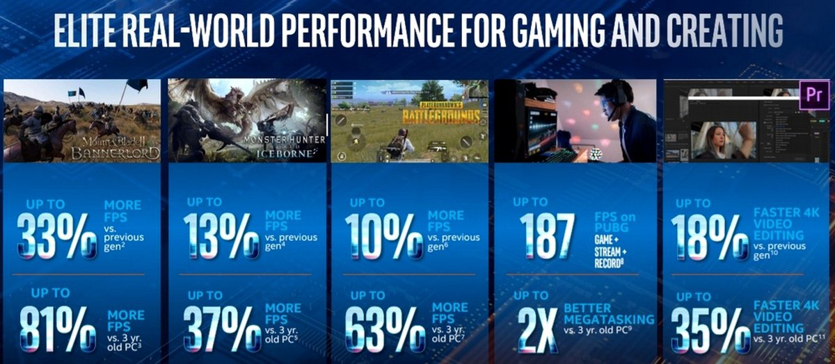 Полноценных игровых тестов процессоров пока нет. По оценке Intel, по сравнению с PC трехлетней давности прирост частоты кадров в Mount & Blade 2 Bannerlord на Core i9-10900K достигает 81%, в PUBG частота кадров может вырасти на 63%.