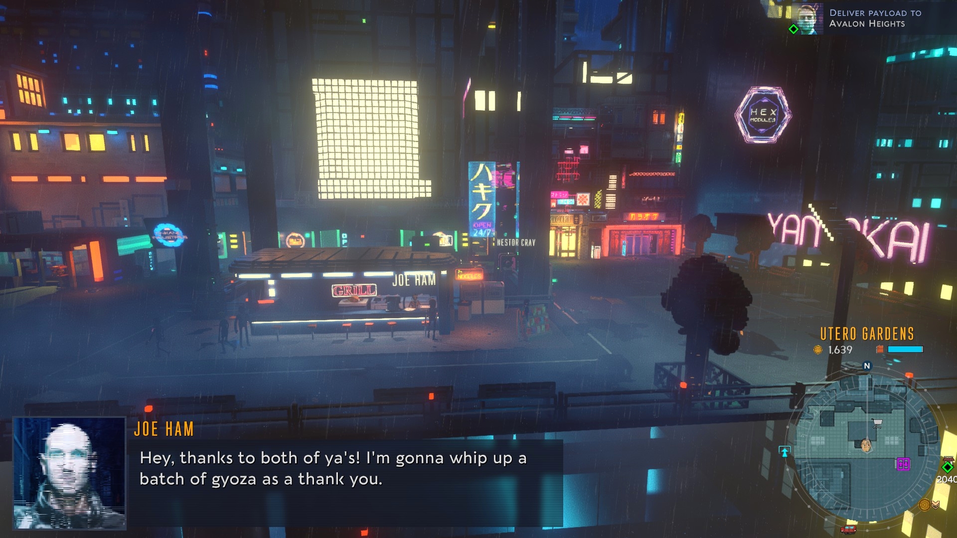 Однако не стоит думать, что Cloudpunk представляет из себя некий бесконечный гринд в погоне за деньгами, нет. В игре есть чётко выраженная сюжетная структура, подающаяся через небольшие истории и диалоги, а бегать за дополнительными материалами, для достижения самой лучшей концовки вас никто не заставит. Наоборот, в нескольких моментах вам даже дадут возможность сделать выбор и, спустя некоторое время, узнать о последствиях.