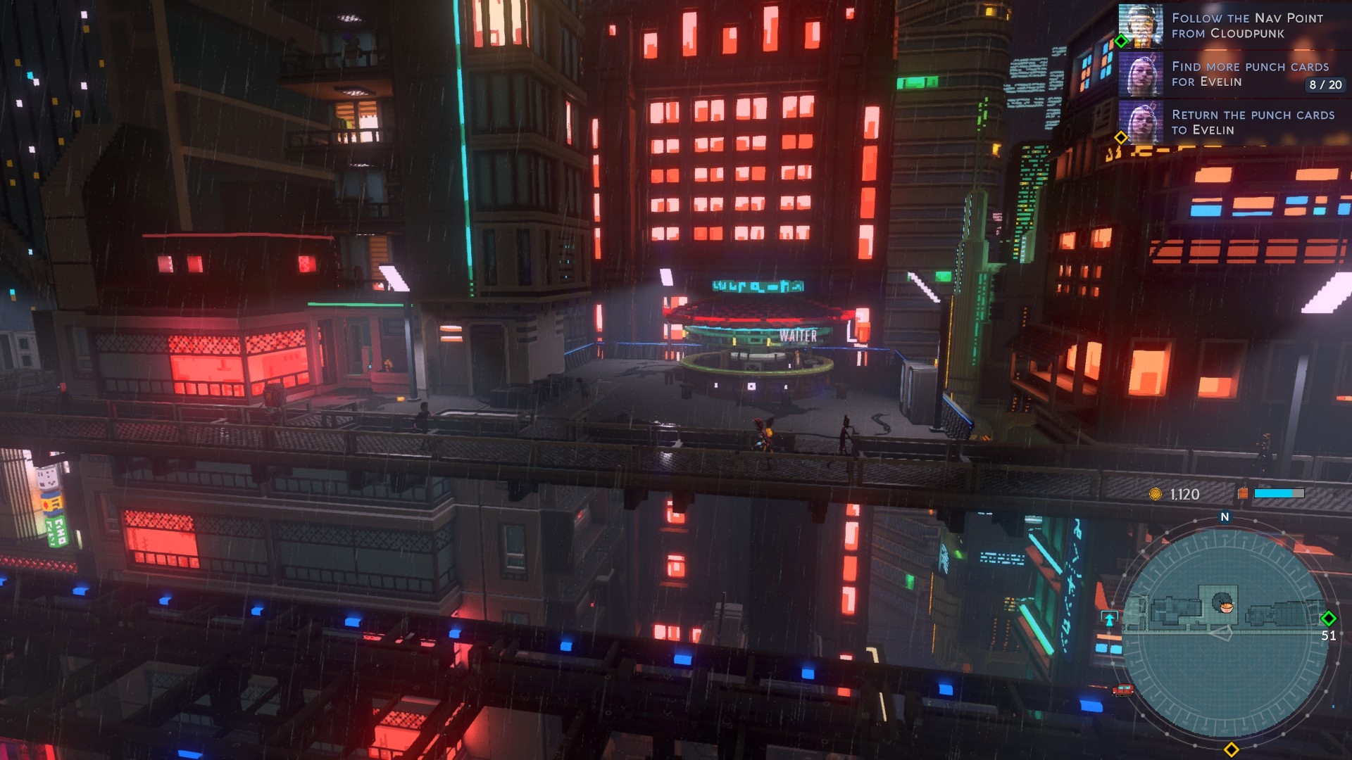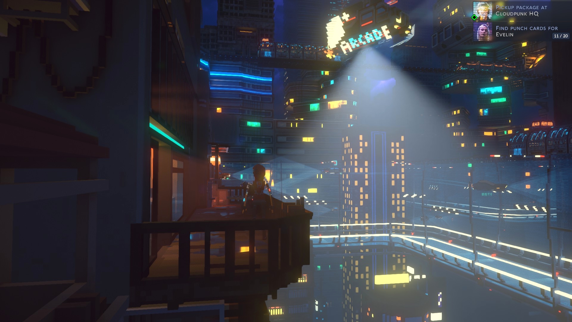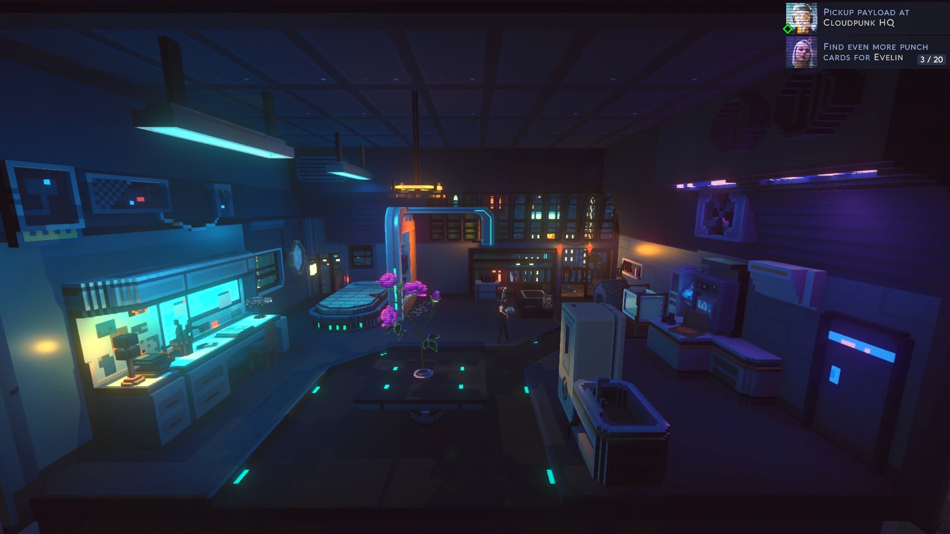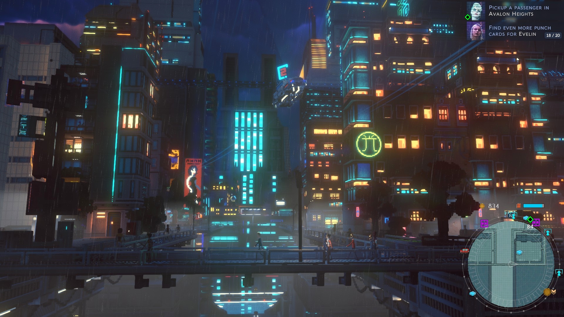Означает ли это, что визуальная часть в игре находится на высшем уровне? Ну, нет. Не совсем. Всё-таки воксельная графика до сих пор значительно уступает традиционным способам разработки с применением полигональных технологий. И тем не менее, картинка в Cloudpunk, к её чести, совсем не режет глаз, а большего от инди игры, обычно, и не требуют.