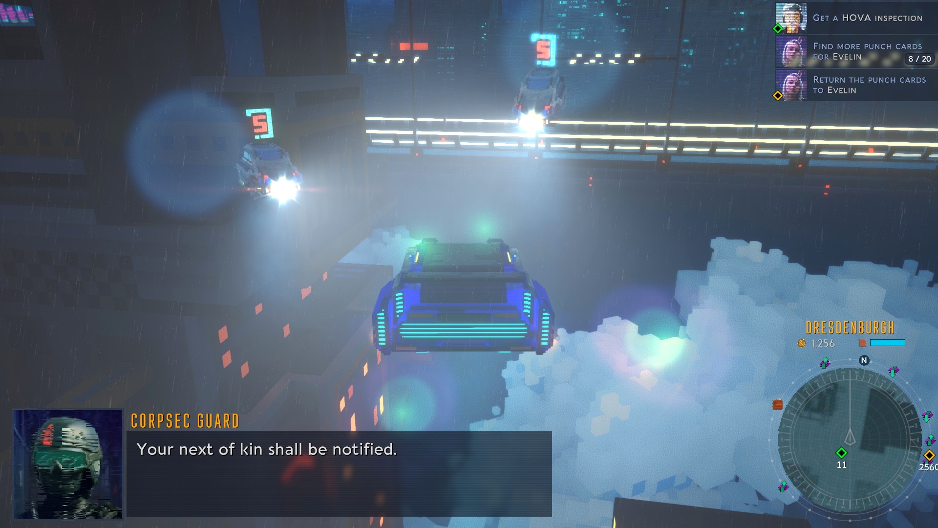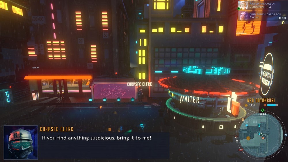 Однако на другой стороне весов стоит геймплей, который полноценно довести до ума разработчикам всё-таки не удалось: Зачем в Cloudpunk столько вещей, которым, по факту, нет применения? За всё время, например, я ни разу не воспользовался стимулянтами, алкоголем и наркотиками. Да и зачем? В игре отсутствует усталость, голод (хотя еда присутствует). Также в игре есть члены организации CorpSec, которые исполняют роль полиции. В самом начале Cloudpunk недвусмысленно намекает вам на то, что этим ребятам нужно будет сдавать всякие опасные штуки, однако за всю игру(!) мною был найден лишь один подходящий элемент.