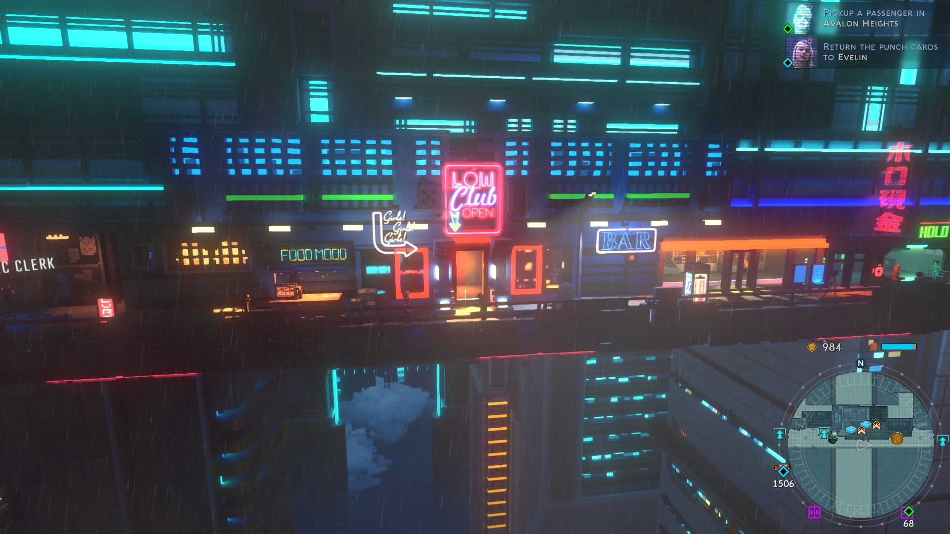 Как вы, наверное, уже догадались из названия статьи, перестрелок и погонь в Cloudpunk не будет - вы играете за обычного человека, которого жизненные обстоятельства поставили в не самую удобную позицию. Нет, несколько раз вам будут давать заказы на время, но в целом, это, скорее, исключение из правил, нежели постоянная механика.