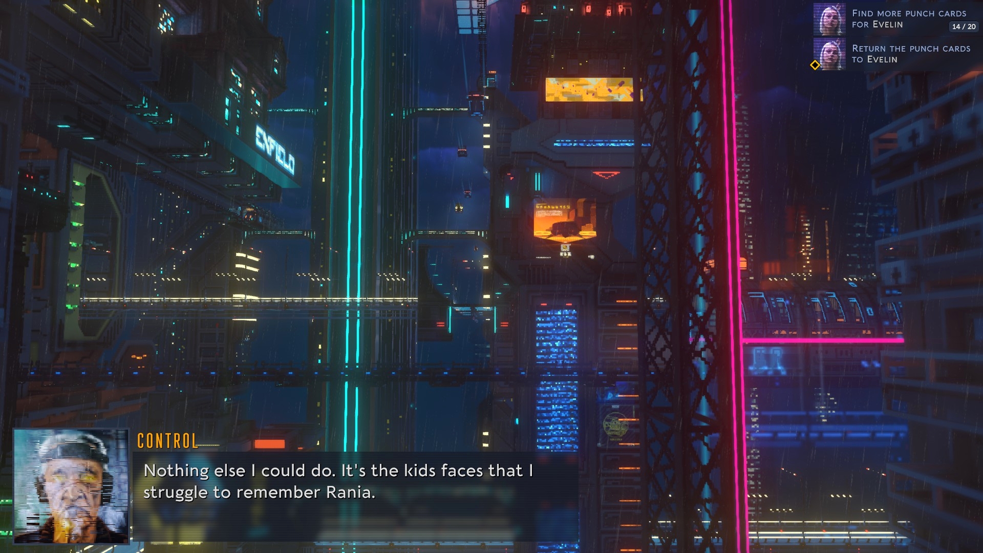 По сути своей, игра держится всего на двух столпах: красивых картинках ночного города и диалогах. Уберите хоть один из этих элементов и вся конструкция рухнет в пропасть. Cloudpunk использует диалоговую систему, как опору, на которую ложится почти вся игра. И хотя местный ЛОР прописан довольно неплохо, такой костыль не может не вызывать определённую обеспокоенность.
