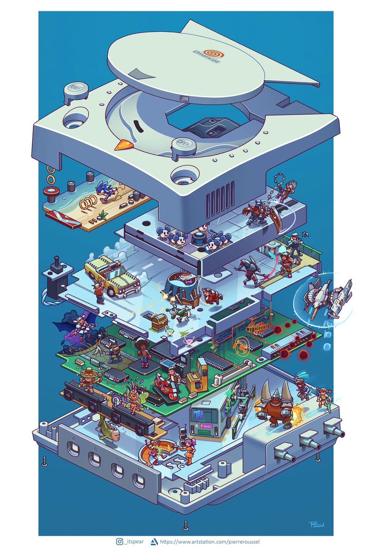 В таком стиле Руссель «разобрал» четыре консоли: PlayStation, Nintendo 64, Sega Dreamcast и Xbox. Во каждой консоли бегают узнаваемые персонажи игр, выходивших на этой платформе, некоторые из них даже умудряются вырваться за границы устройства.