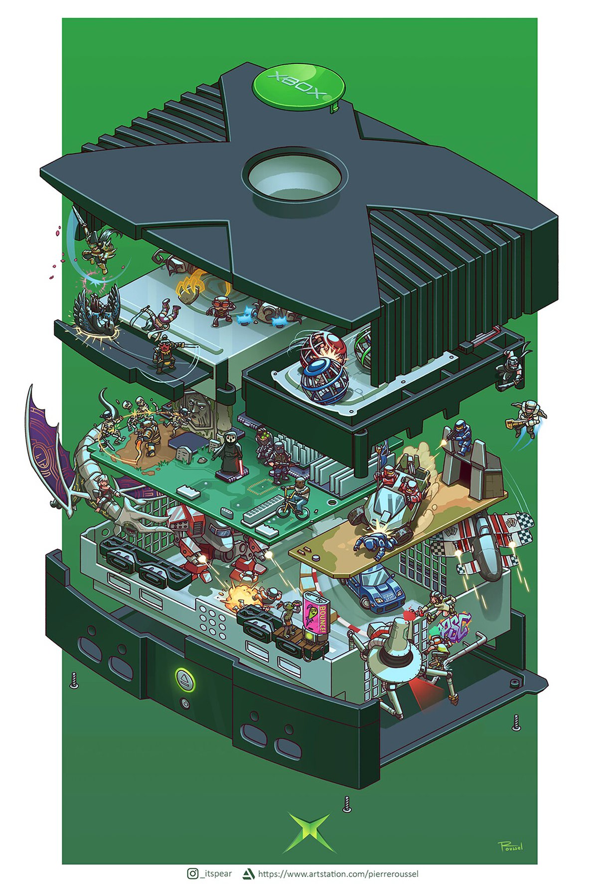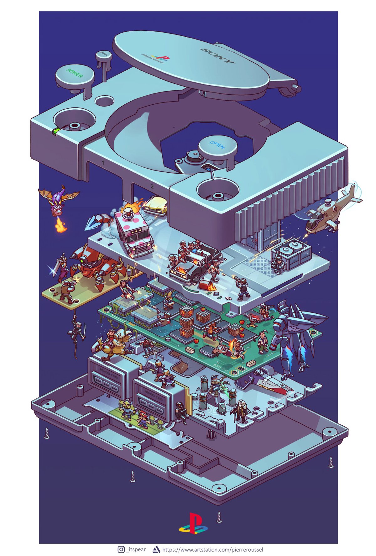 В серии артов Console Explosion Пьер попытался представить, как могли бы выглядеть внутренние миры консолей. Теперь битва идет среди микросхем и кнопок: Снейк укрывается от вертолета за каким-то реле, а Крэш Бандикут прыгает по чипам.