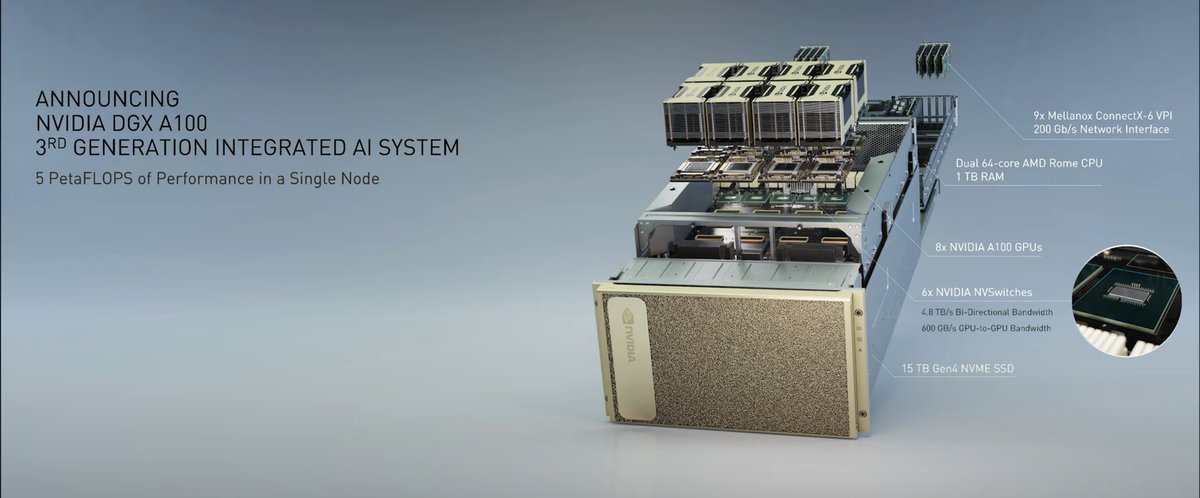 Основную вычислительную мощность DGX A100 обеспечивают восемь ускорителей A100. В общей сложности у них 320 гигабайт скоростной памяти, общая производительность кластера в вычислениях, связанных с ИИ, составляет 5 петафлопс.