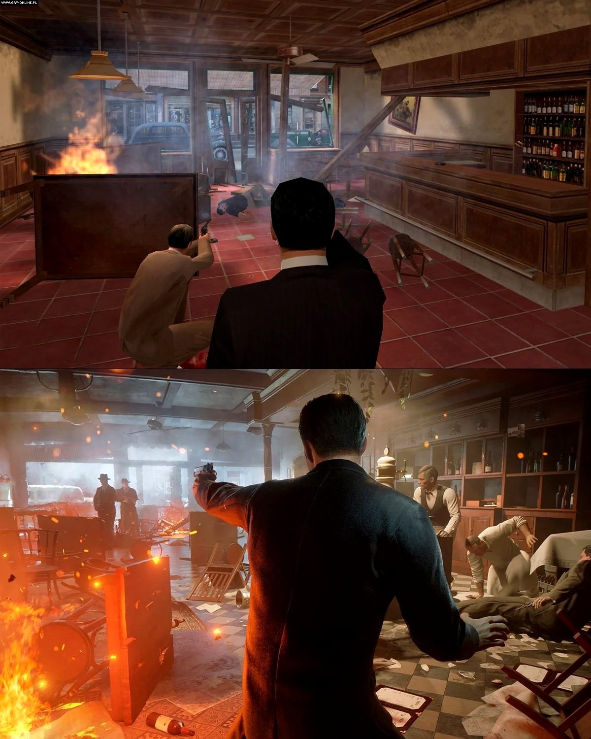 Все сравнительные скриншоты сделаны в ходе прохождения сюжетных заданий. На первом кадре Томми и Сальери переживают нападение в ресторанчике Пепе.