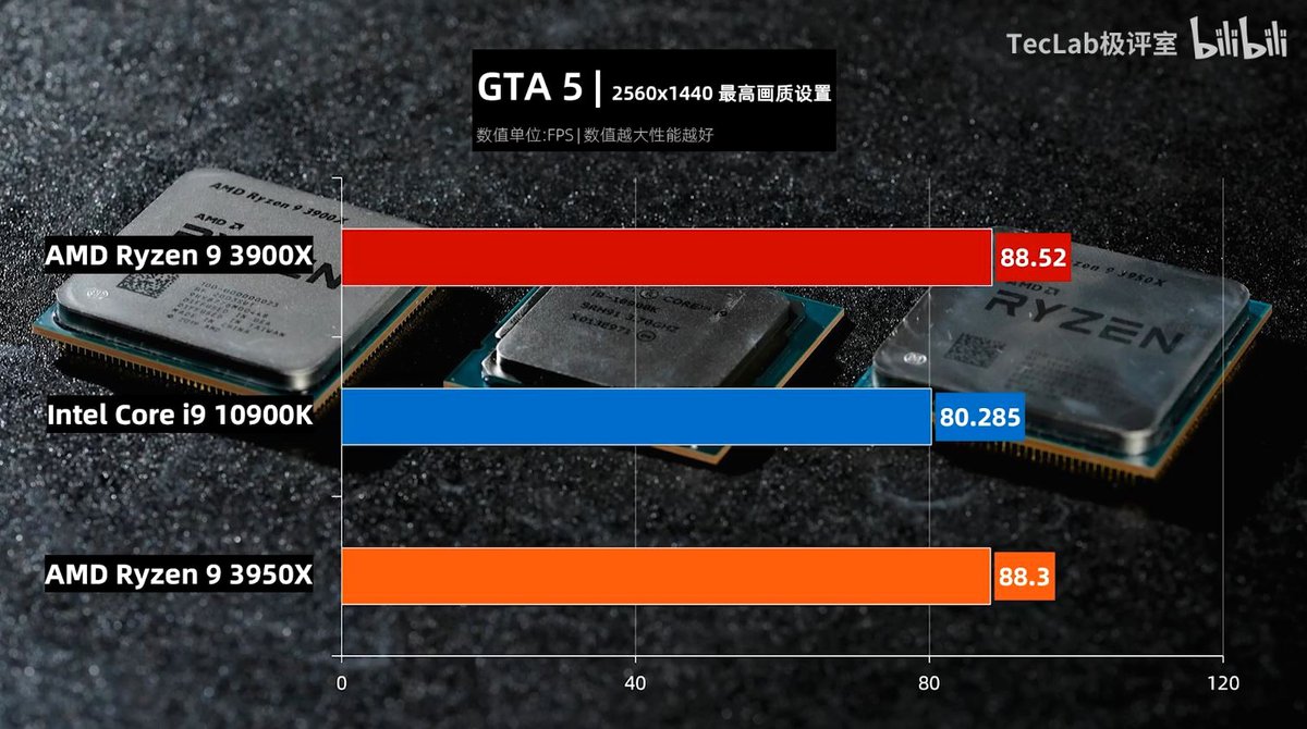 Все игры запускались в разрешении 1440p на видеокарте GeForce RTX 2080 Ti. Самое большое преимущество Core i9-10900K показал в Far Cry 5, обойдя Ryzen 9 3950X на 16%. В GTA 5 процессор Intel отстал от конкурентов на 10%.