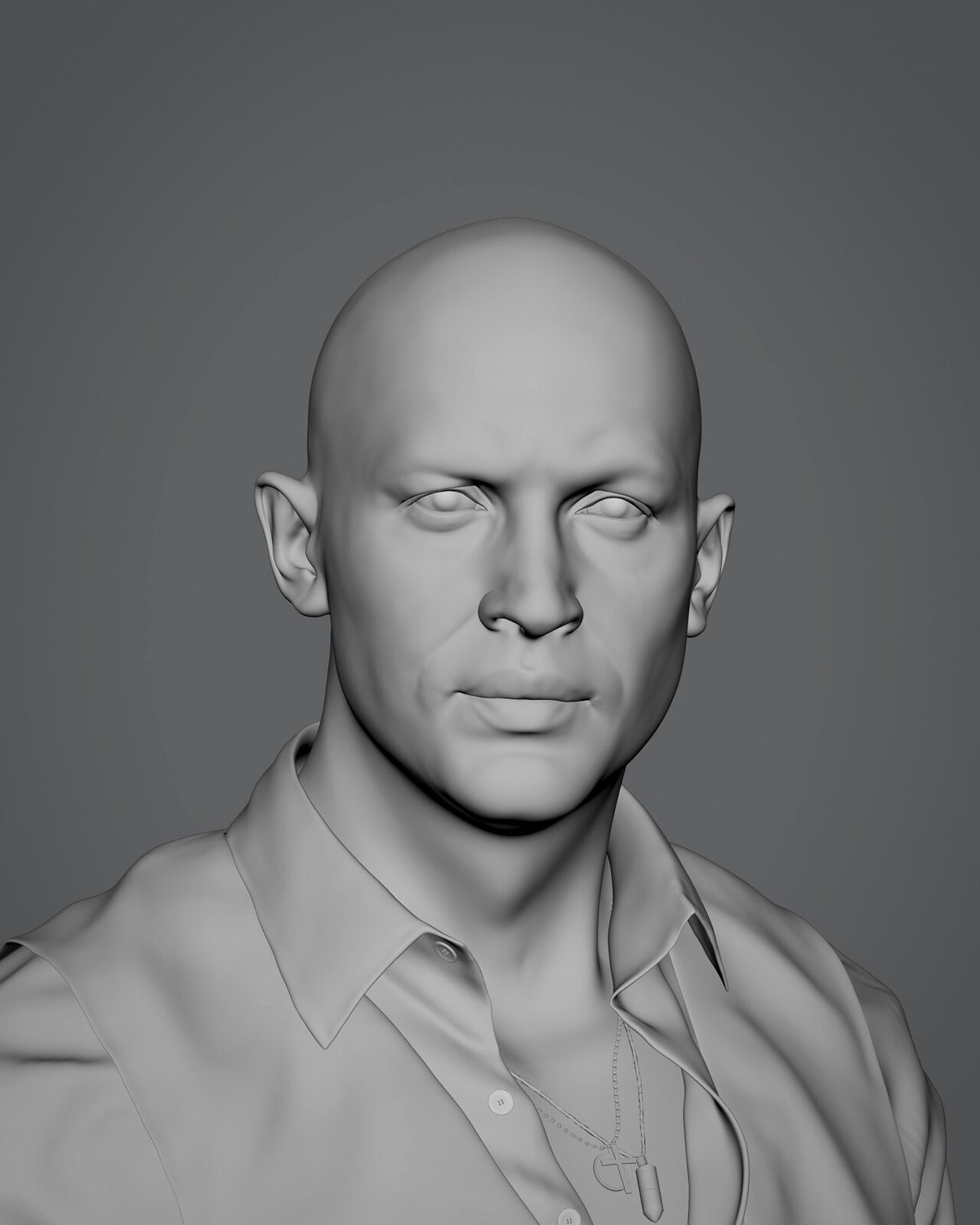 Судя по сеткам, которые время от времени выкладывает художник, здесь используются десятки, но не сотни тысяч полигонов. Это сопоставимо с тем, что можно увидеть в играх: к примеру, голова Кратоса из последнего God of War сделана из 32 тысяч полигонов.