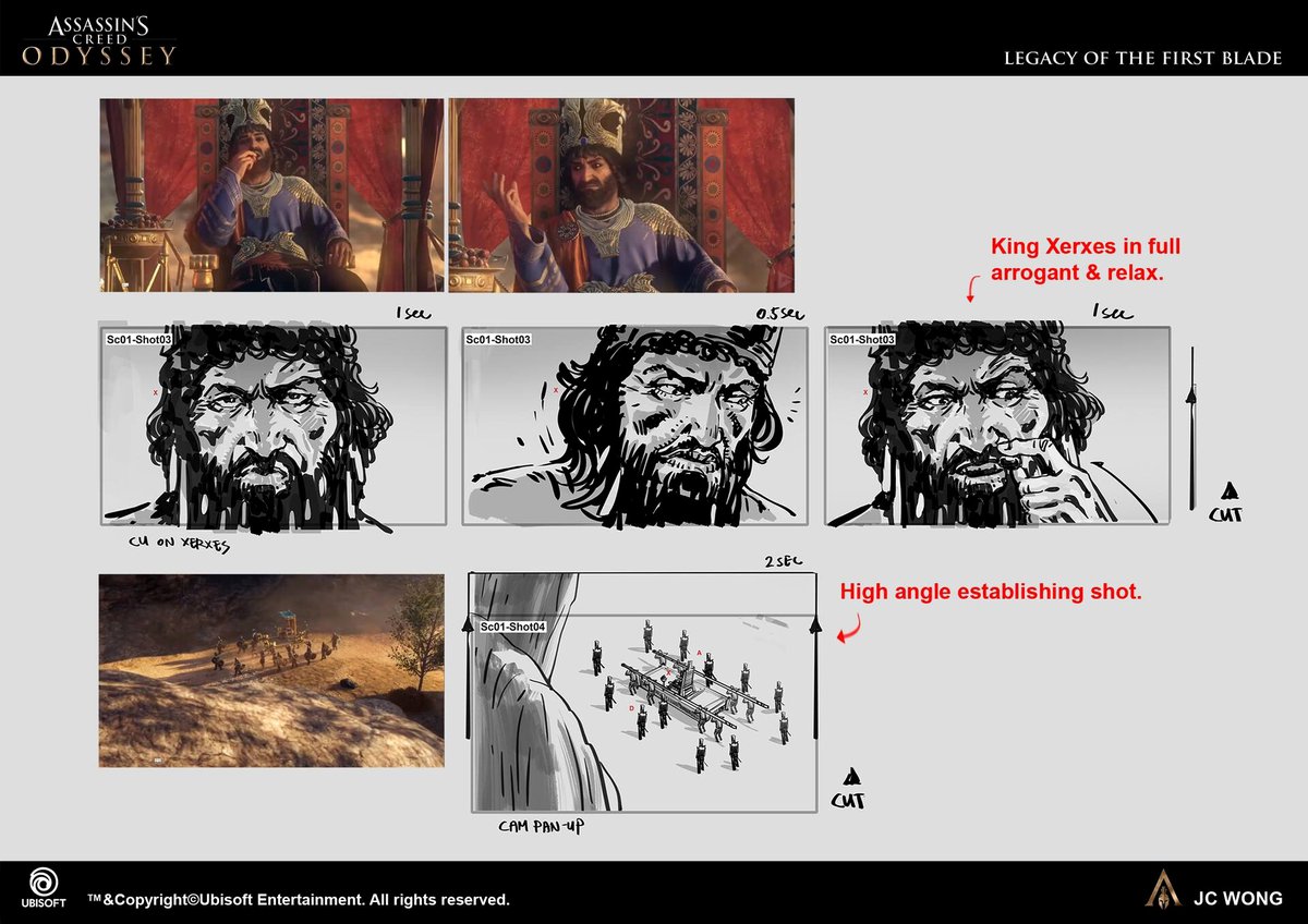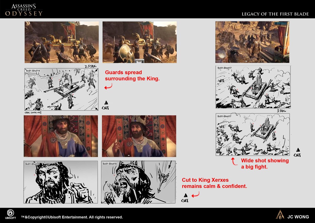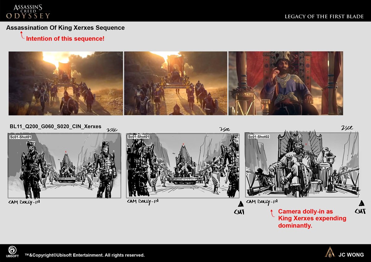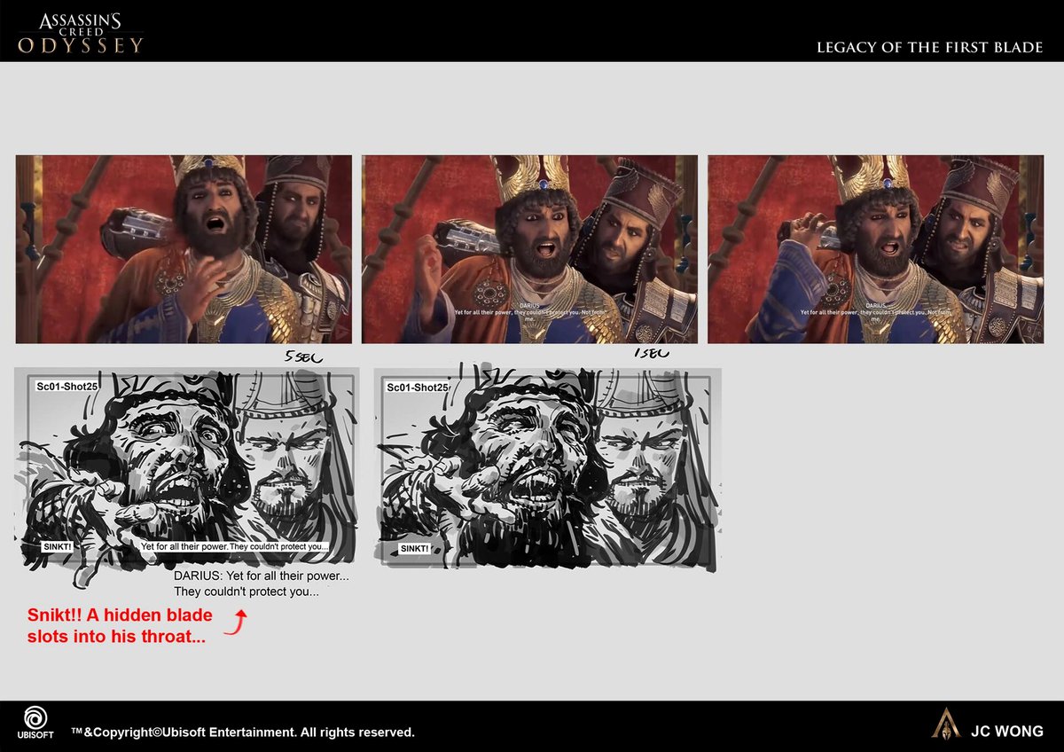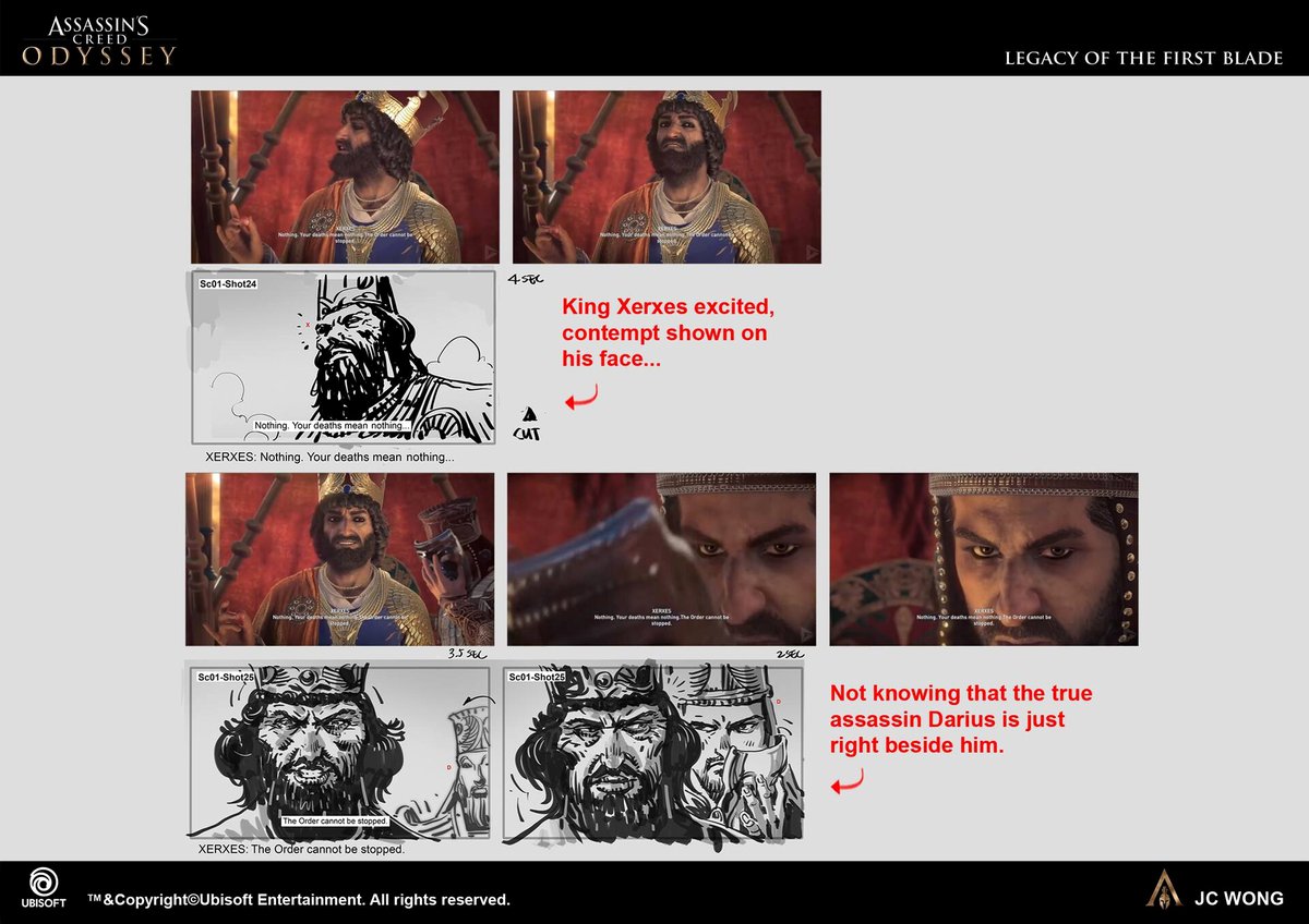 В «Наследии скрытого клинка», первом дополнении для Assassin’s Creed Odyssey, есть момент, когда ассасин Дарий, владелец первого скрытого клинка, убивает Ксеркса, царя персов. Над этой сценой работал Цзин Ченг Вонг, старший концепт-художник из сингапурского подразделения Ubisoft.