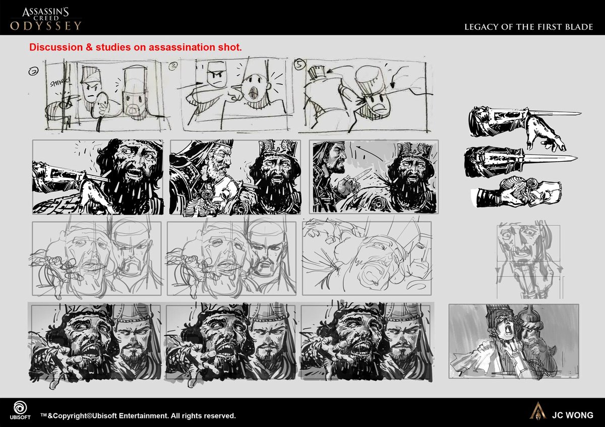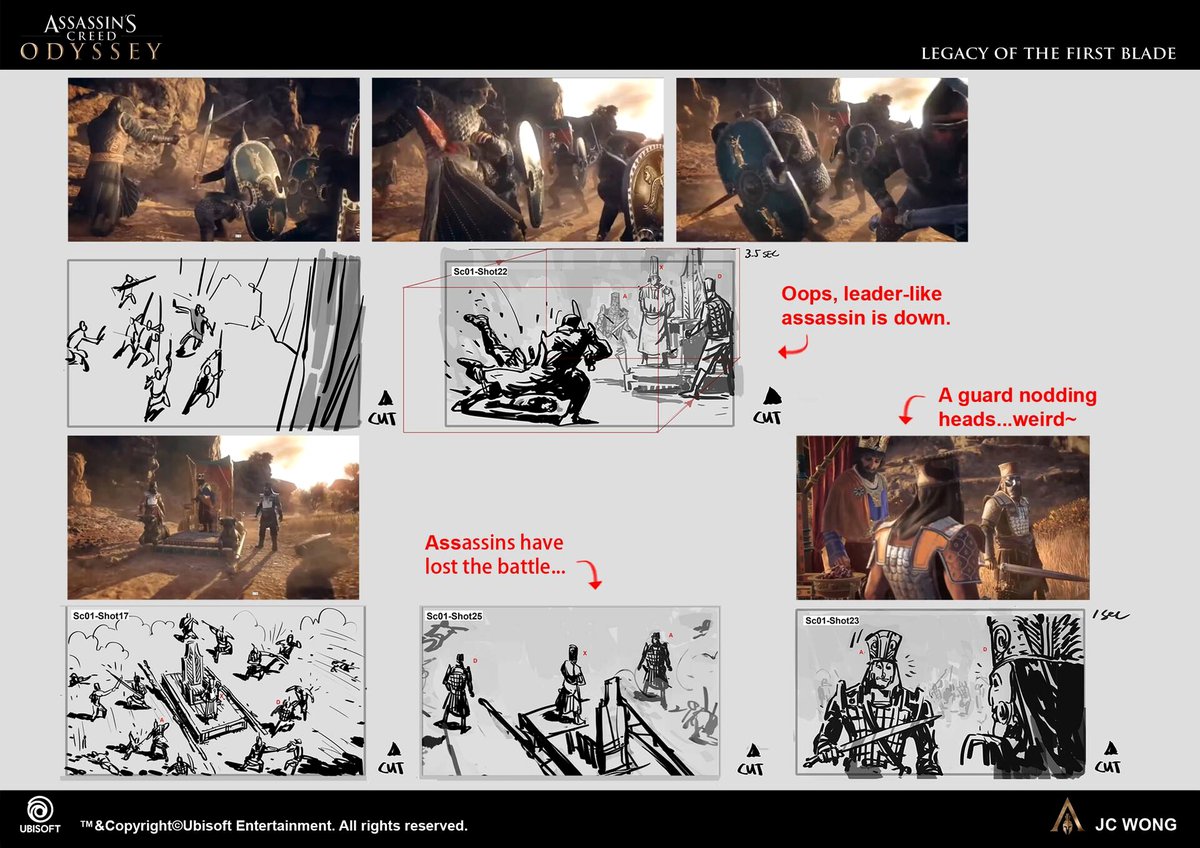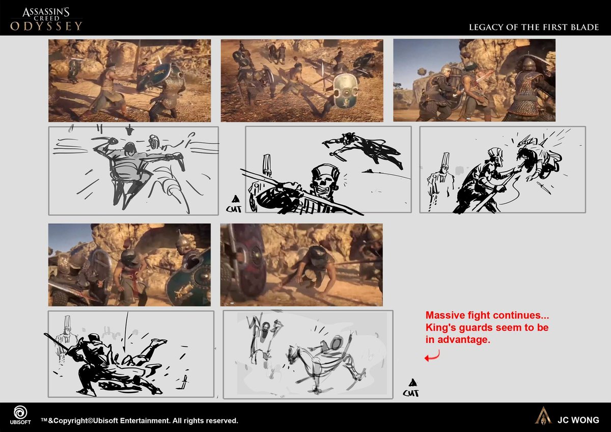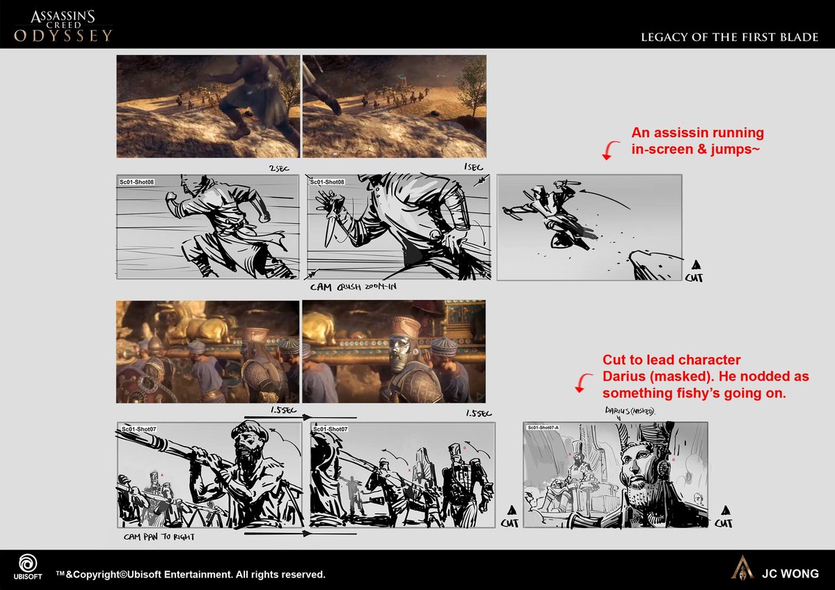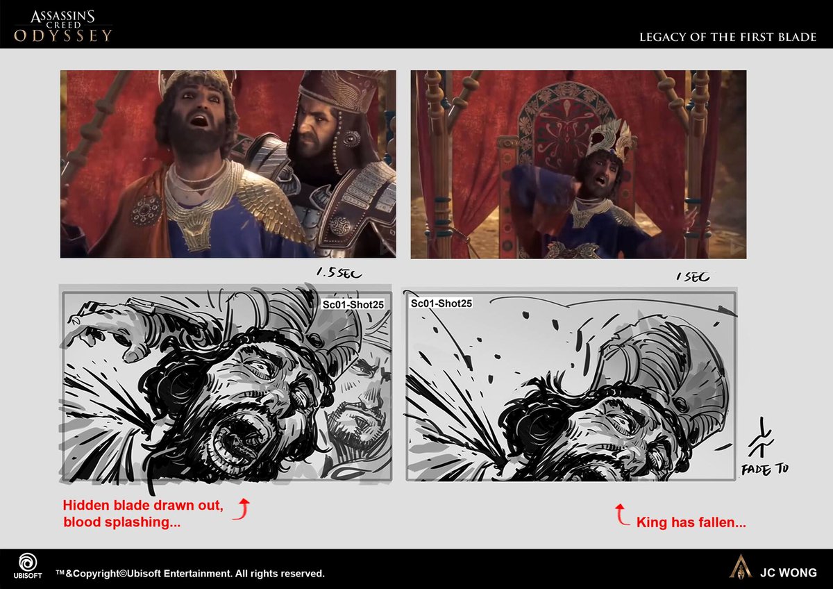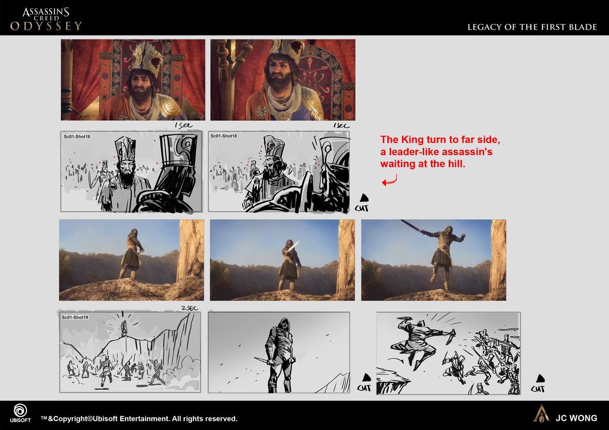 В «Наследии скрытого клинка», первом дополнении для Assassin’s Creed Odyssey, есть момент, когда ассасин Дарий, владелец первого скрытого клинка, убивает Ксеркса, царя персов. Над этой сценой работал Цзин Ченг Вонг, старший концепт-художник из сингапурского подразделения Ubisoft.