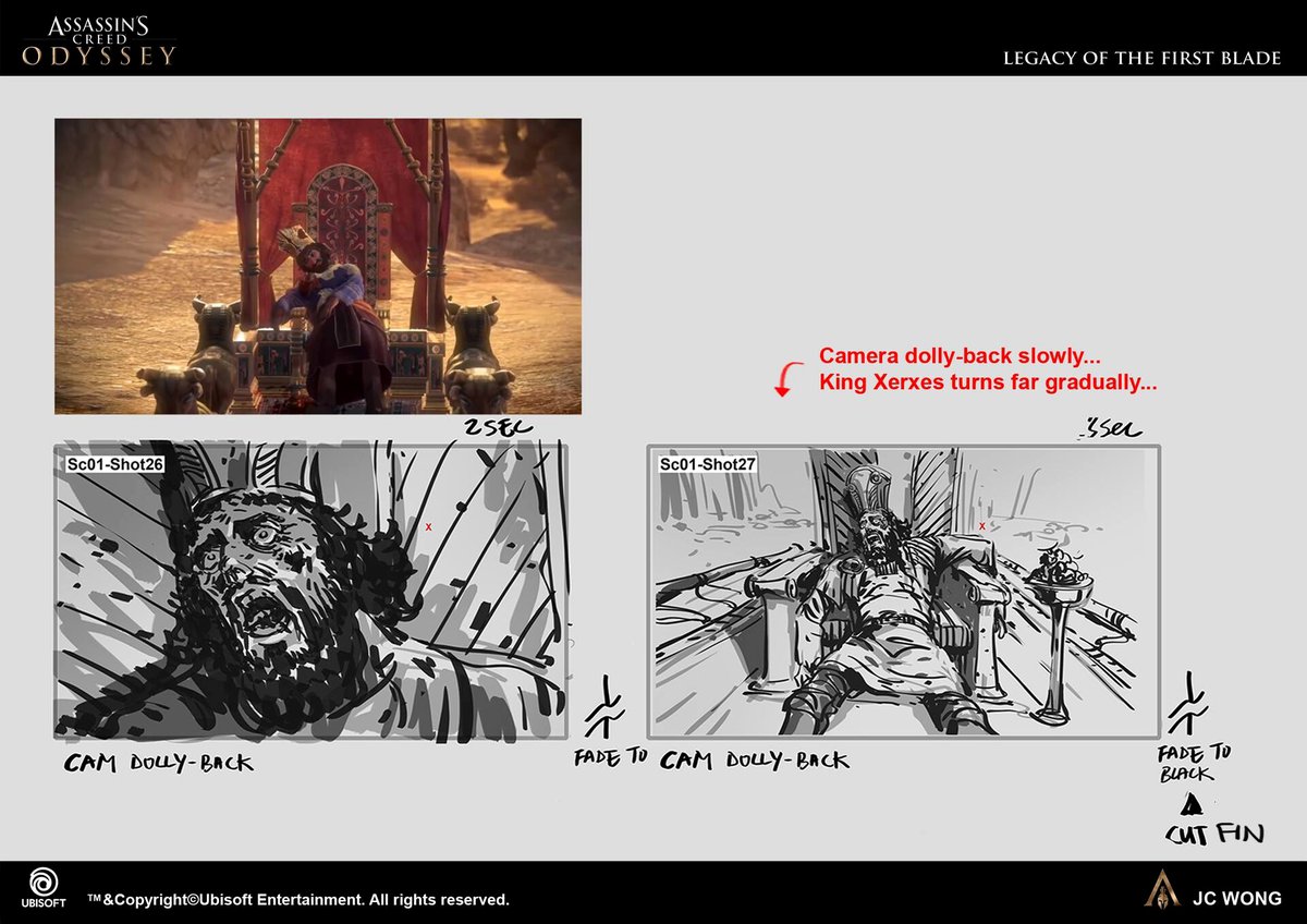Самое интересное концепт-художник показал на последнем слайде. В финальной версии катсцены Дарий убивает Ксеркса, подобравшись сзади; на этапе планирования сцены предлагалось несколько других вариантов атаки.