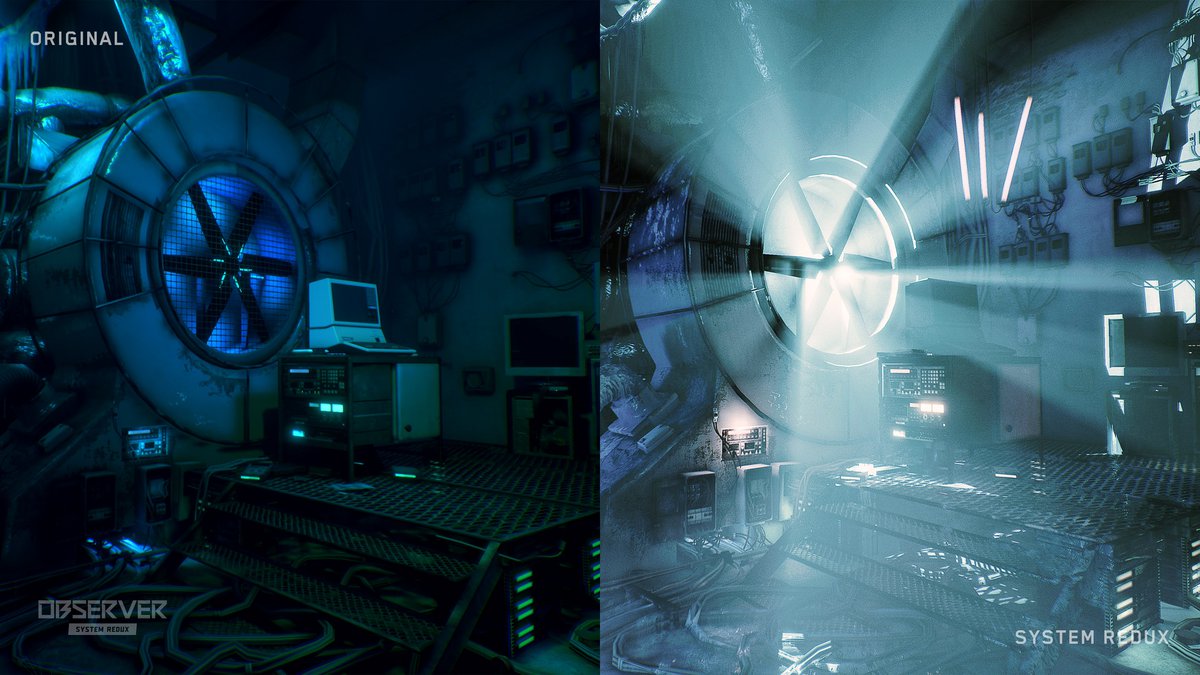 Судя по сравнительному скриншоту, основной акцент решено сделать на освещении: его модель в Observer System Redux стала гораздо реалистичнее. Появились сложные темы — обратите внимание на пол под настилом, — а глобальное освещение теперь напоминает то, что можно сделать при помощи трассировки лучей.