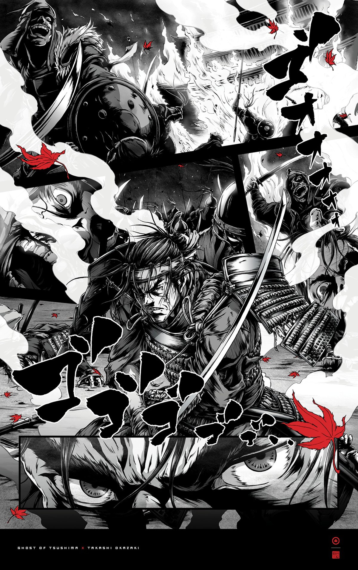 Его манга «Афросамурай» так понравилась разработчикам, что они связались с Окадзаки и попросили его нарисовать несколько постеров для Ghost of Tsushima. В результате Такаси создал четыре работы в стиле своей манги.