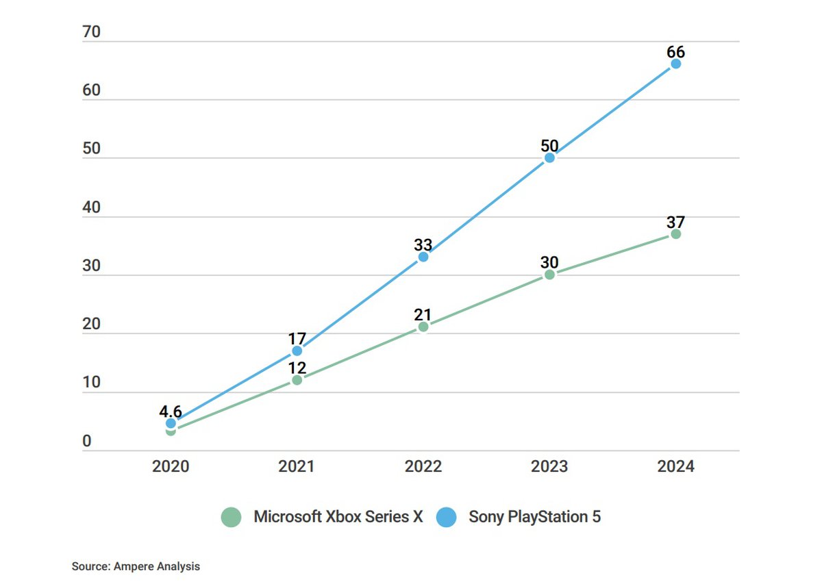 Аналитики ожидают, что до конца 2020 года будет продано 4.6 миллиона PlayStation 5 и 3.3 миллиона Xbox Series X. К 2024 году число проданных PlayStation 5 достигнет 66 миллионов, показатели Xbox Series X будут почти вдвое меньше.