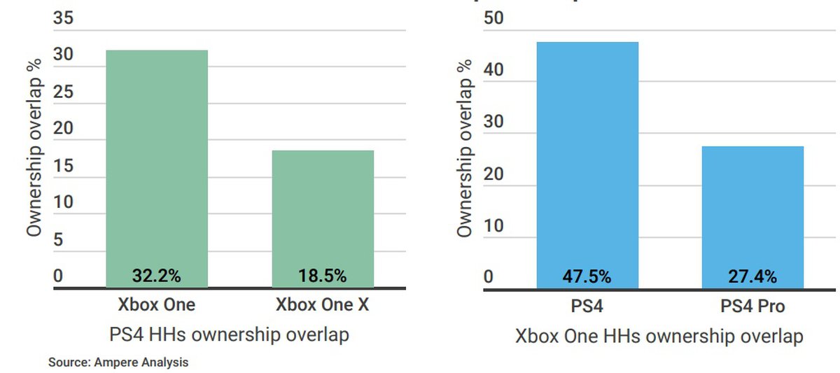 Опрос проводился в первом квартале 2020 года, аналитики отдельно опрашивали владельцев Xbox One и PlayStation 4. Оказалось, что у 47.5% игроков, владеющих Xbox One, есть еще и PlayStation 4. У 27.4% опрошенных есть PlayStation 4 Pro.